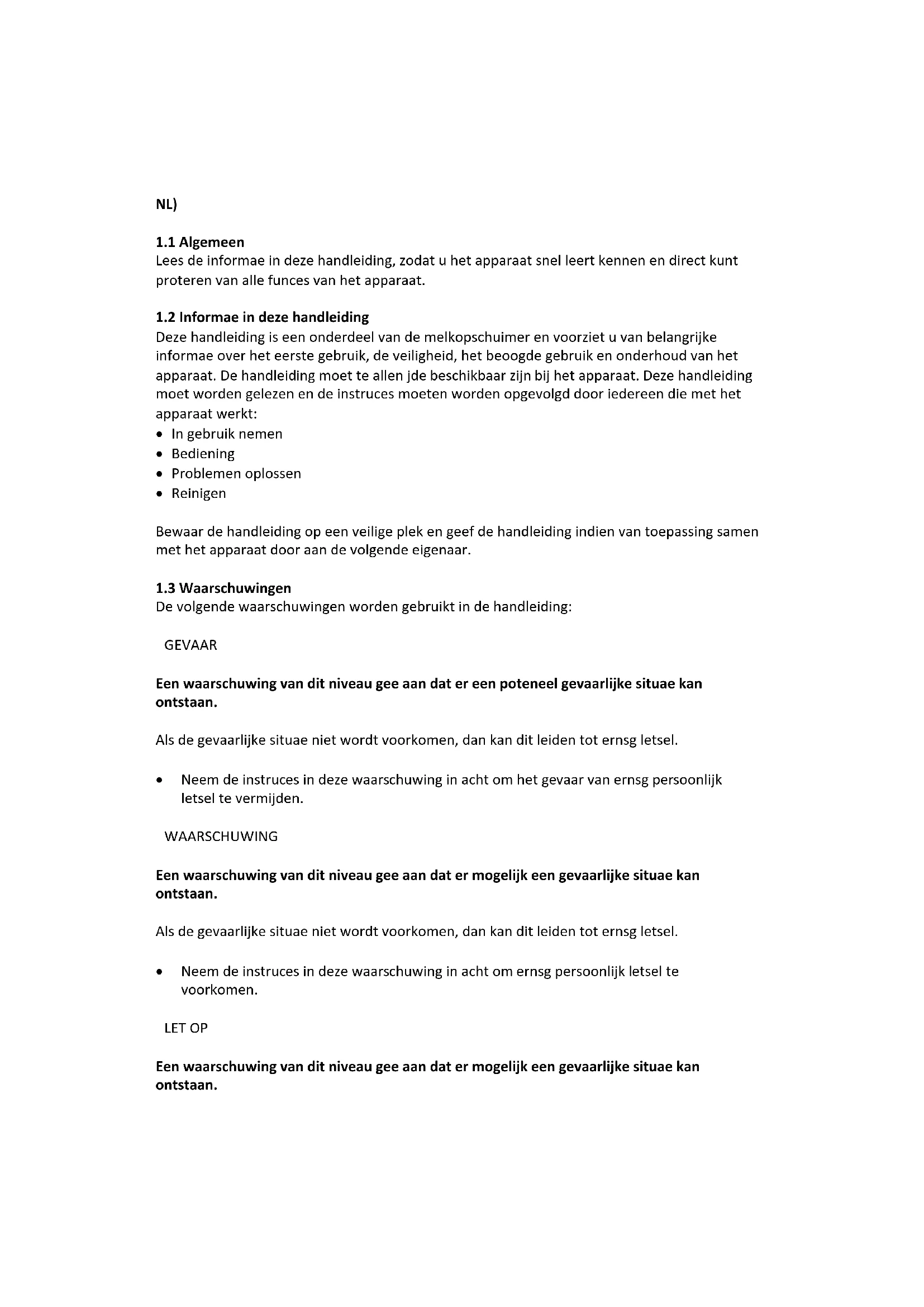 Deze handledeiding is een onderdeel van de melkopschuimer en voorziet u van belangrijke informae over het eerste gebruik, de veriligheid, het beoogde gebruik en onderhoud van het apparaat. De handleiding要去 allen jde beschikbaar bij het apparaat. Deze handledeiding要去 worden gelezen en de instruces要去en worden opgevolgd door iedereen die met het apparaat werk: