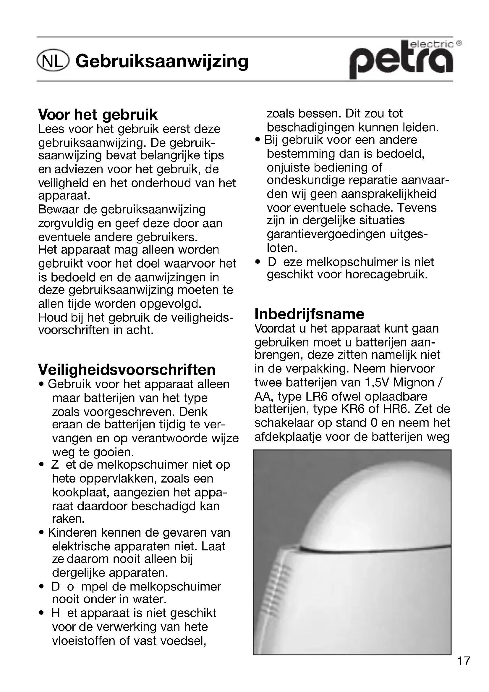 Gebruiksaanwijzing NLdoor licht op het geribbelde oppervlak te drukken. Let bij het inbrengen van de batterijen goed op de aangegeven positie van de polen. Breng daarna het afdek- plaatje weer zodanig aan dat de geribbelde oppervlakken op elkaar aansluiten. Wanneer het toerental van het apparaat duidelijk teru- gloopt, is dat een teken dat de bat- terijen vervangen moeten worden. Ook wanneer u het apparaat lange- re tijd niet heeft gebruikt dient u nieuwe batterijen te gebruiken. Gebruik Deze melkopschuimer is ontworpen voor het verwerken van vloeibare producten in kleine hoeveelheden. Het apparaat is niet geschikt voor relatief grote hoeveelheden en dik- ker of vast voedsel. U dient het apparaat grondig te rei- nigen alvorens het te gaan gebrui- ken. Om spatten tijdens het gebruik te voorkomen, moet u deze stelre- gel onthouden: schakel het appa- raat pas in wanneer de klopper zich in de vloeistof bevindt. Een voor- werp met een hoge rand, zoals een drinkglas, is daarom het meest geschikt. De vloeistof zal vrijwel meteen na het inschakelen met de klopper in de houder gaan draaien. Dit moet door een tegengesteld draaiende beweging van de melkopschuimer voorkomen worden. Wanneer het schuim omhoogkomt, moet u de melkopschuimer iets omhoogtrek- ken zodat het uiteinde net onder het oppervlak blijft werken. Opschuimen van melk In principe is iedere soort melk geschikt. Het resultaat kan echter beïnvloed worden door de mate van versheid en pasteurisatie van de melk. Melk met een relatief laag vetgehalte laat zich in de regel beter opschuimen. Vul een glas tot maximaal 1/4 van de inhoud. Laat de melk na het opschuimen 1-2 minuten rustig staan. Zo krijgt het schuim een optimale vastheid. Nadat u de schuimlaag van de melk heeft geschept kunt u de resterende hoeveelheid melk opnie- uw gaan opschuimen. Bereiden van mixdrankjes 18Vul het glas tot maximaal 2/3 van de inhoud om te voorkomen dat de vloeistof overloopt. Voeg geen vaste producten zoals bessen, toe. Kloppen van slagroom Verwerk maximaal 100ml goed gekoelde slagroom, precies zoals u melk opschuimt. Maken van een dressing voor salade Meng de ingrediënten in een glas voor een probleemloos resultaat. Kloppen van eiwit Doe het eiwit van maximaal twee eieren in een beker of glas. Bij het opkloppen moet u erop letten dat de dat de klopper altijd vlak onder het oppervlak draait. Zou de schijf te diep zitten, dan zal het toerental sterk teruglopen en het gewenste resultaat niet bereikt worden. Reiniging en onderhoud Het is raadzaam om het apparaat meteen na ieder gebruik te reini- gen. De klopper laat zich het beste reinigen door deze in een glas met water en wat afwasmiddel te hou- den en het apparaat daarna in te schakelen. Bij hardnekkige, vastzittende (aan- gekoekte) resten kunt u de klopper voorzichtig verwijderen en daarna reinigen. Veeg de buitenkant uitsluitend met een vochtige doek schoon. Zet de melkopschuimer na het rei- nigen weer terug in de houder. Wilt u het apparaat op zijn kant wegleg- gen dan moet u erop letten dat de klopper niet kan verbuigen. Het apparaat voldoet aan de EU richtlijn Nr. 89/336 EWG. Technische wijzigingen zijn voorbehouden. Verpakkingsmateriaal volgens de voorschriften weggooien. 19petra-electric Kundendienst Greisbacherstraße 6 89331 Burgau www.petra-electric.de Änderungen vorbehalten - 04/02 - 4924 0197
