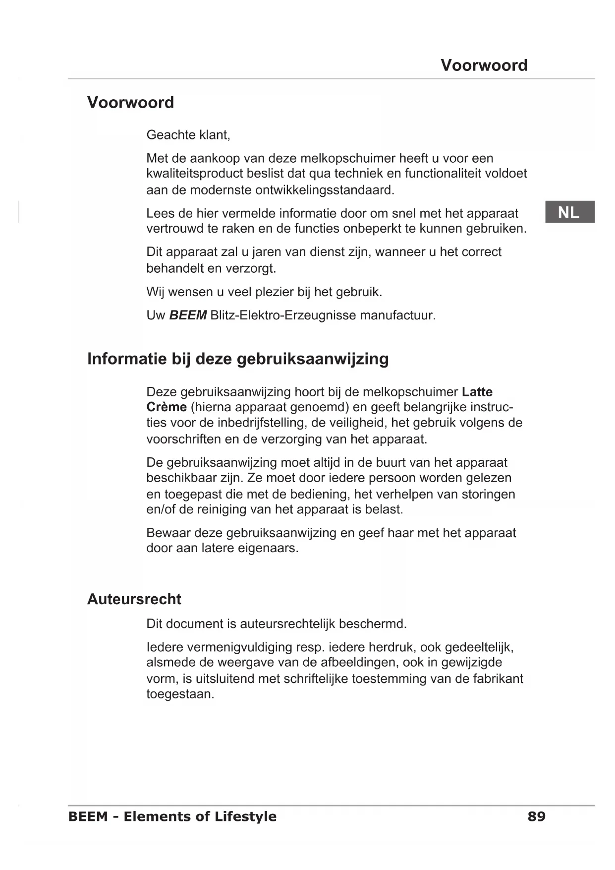 Deze gebruiksaanwijzing hoort bij de melkopschuimer Latte Crème (hierna apparaat genoemd) en geeft belangrijke instru cties voor de inbedrijfstelling, deeiligheid, het gebruik volgens de voorschriften en de verzorging van het apparaat.