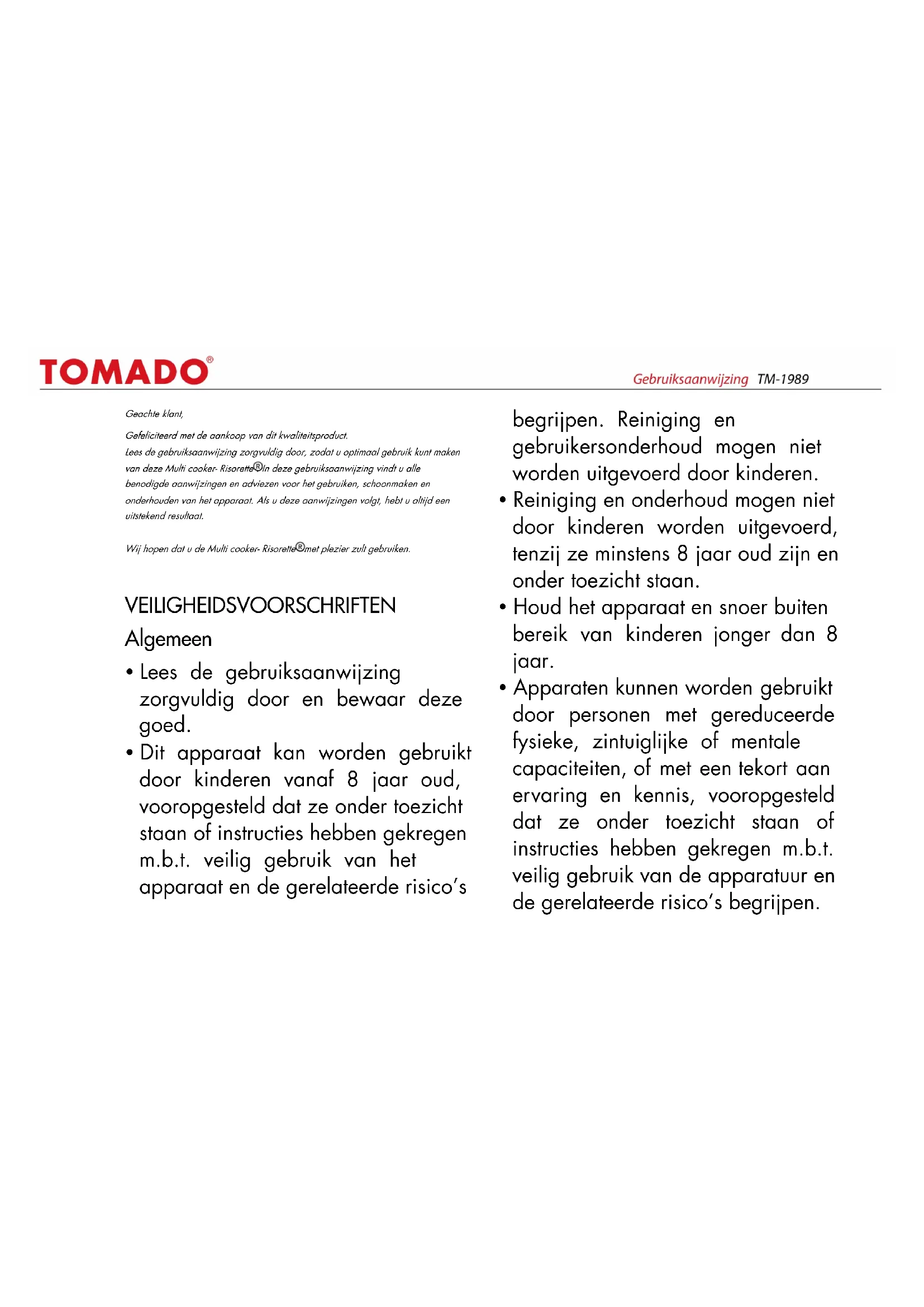 Wij feliciteren u met de aanschaf van een apparaatuit het TOMADO-assortiment.