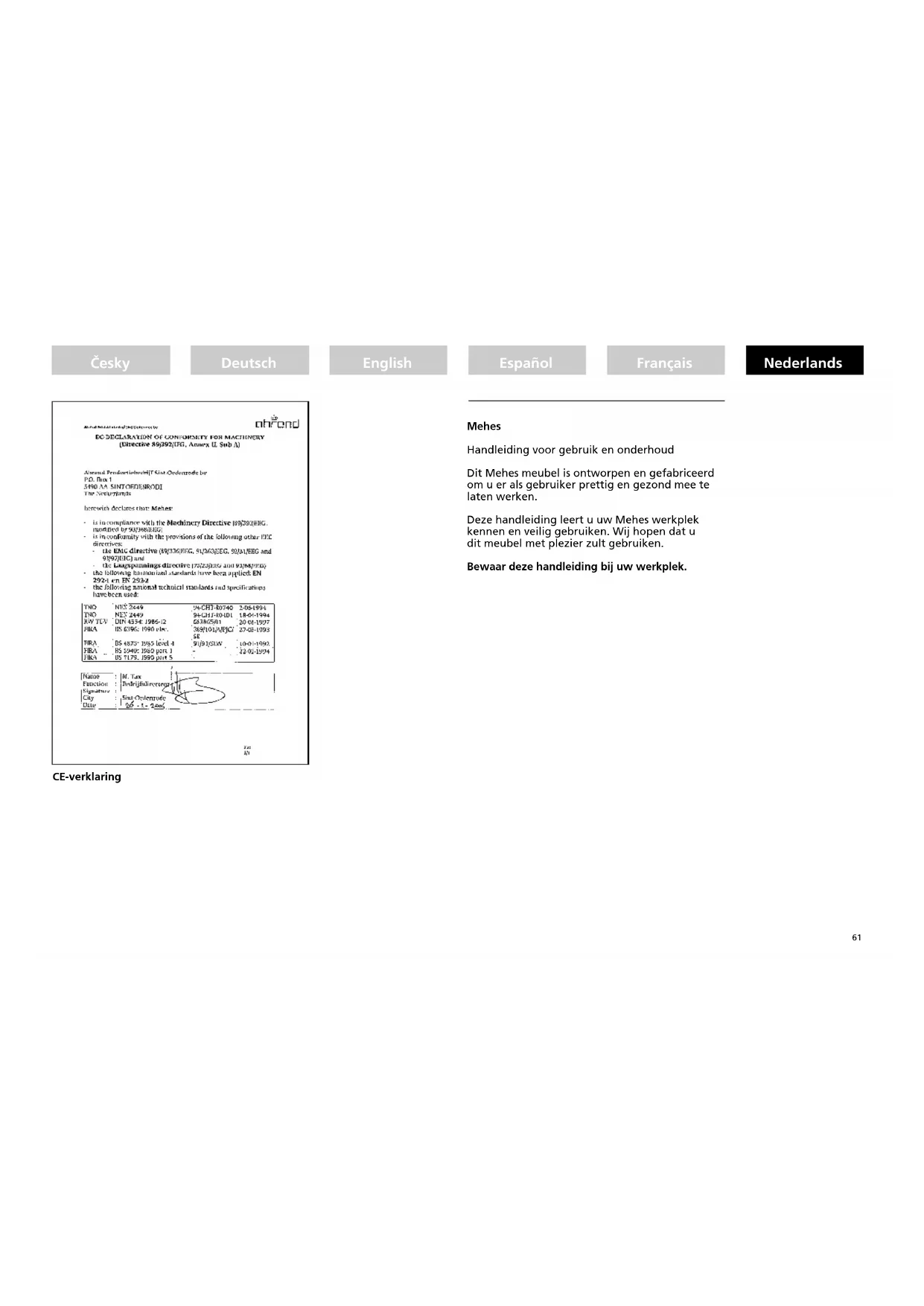 Deze handeisting leert u uw Mehes werkplek kennen en veilig gebruiken. Wij hopen dat u dit meubel met plezier zult gebruiken.