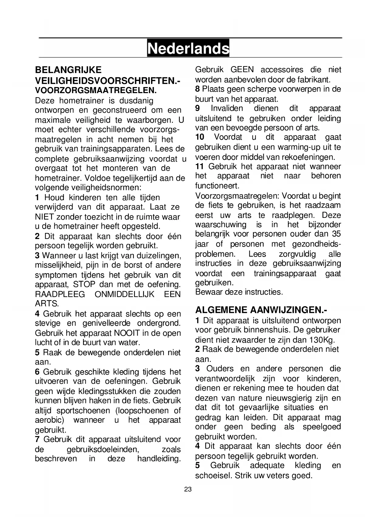 1 Houd kinderen ten alle tijden verwijderd van dit apparaat. Laat ze NIET zonder toezicht in de ruimte waar u de hometrainer heeft opgesteld.