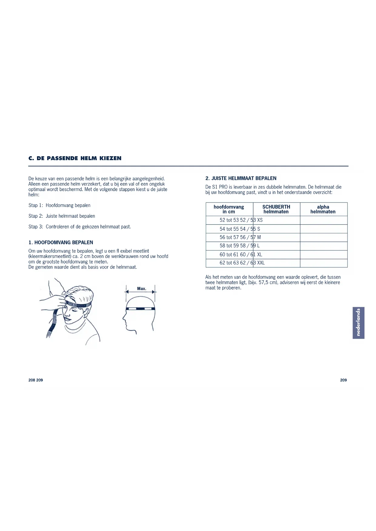 Om uw hoofdomvang te bepalen, legt u een fl exibel meetlint (kleermakersmeetlint) ca. 2 cm boven de wenkbrauwen rond uw hoofd om de grootste hoofdomvang te meten. De gemeten waarde dient als basis voor de helmmaat.211 nederlands