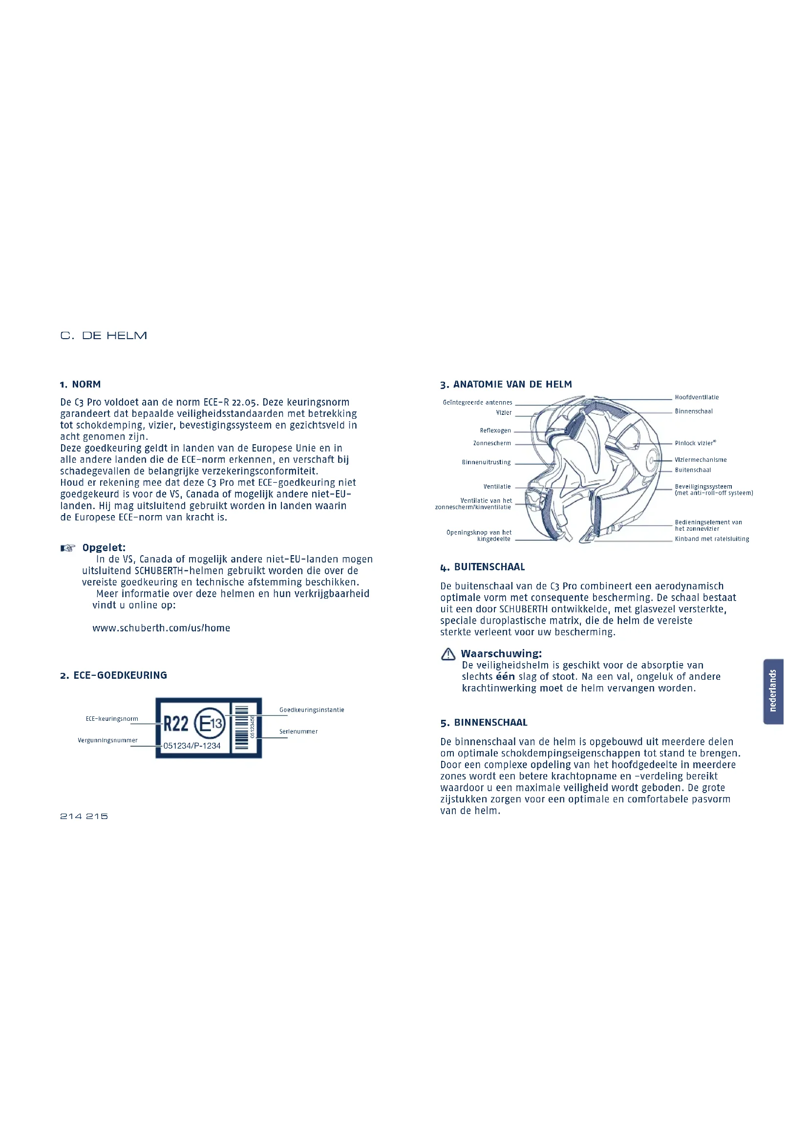 De C3 Pro voldoet aan de norm ECE-R 22.05. Deze keuringsnorm garandeert dat bepaalde veiligheidsstandaarden met betrekking tot schokdemping, vizier, bevestigingssysteem en gezichtsveld in acht genomen zijn. Deze goedkeuring geldt in landen van de Europese Unie en in alle andere landen die de ECE-norm erkennen, en verschaft bij schadegevallen de belangrijke verzekeringsconformiteit. Houd er rekening mee dat deze C3 Pro met ECE-goedkeuring niet goedgekeurd is voor de VS, Canada of mogelijk andere niet-EU- landen. Hij mag uitsluitend gebruikt worden in landen waarin de Europese ECE-norm van kracht is. Opgelet: In de VS, Canada of mogelijk andere niet-EU-landen mogen uitsluitend SCHUBERTH-helmen gebruikt worden die over de vereiste goedkeuring en technische afstemming beschikken. Meer informatie over deze helmen en hun verkrijgbaarheid vindt u online op: www.schuberth.com/us/home