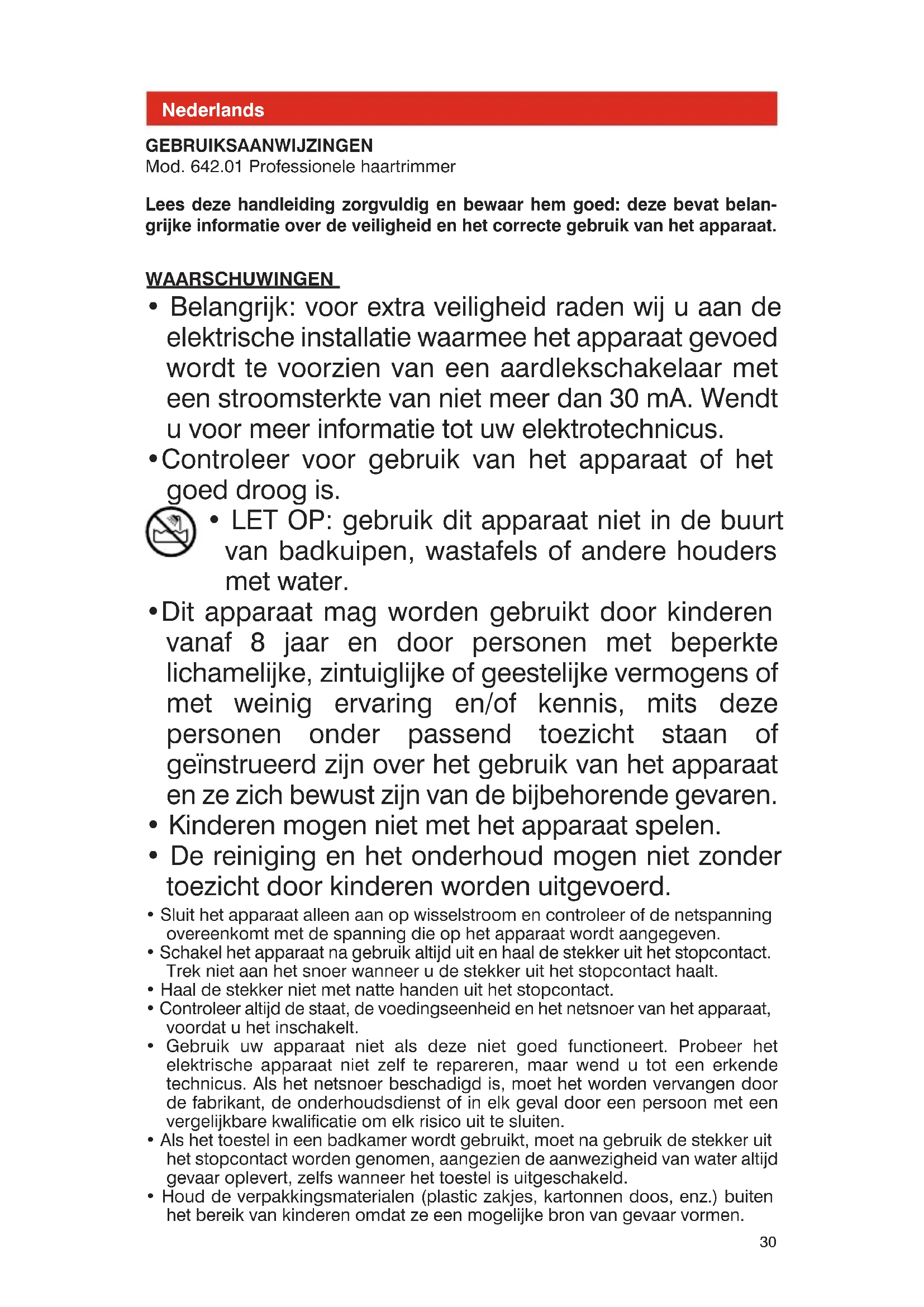 - Belangrijk: voor extra veiligheid raden wij u aan de elektrische installatie waarmee het apparaat gevoed wordt te voorzien van een aardlekschakelaar met een stroomsterkte van niet meer dan 30 mA. Wendt u voor meer informatie tot uw elektrotechnicus.