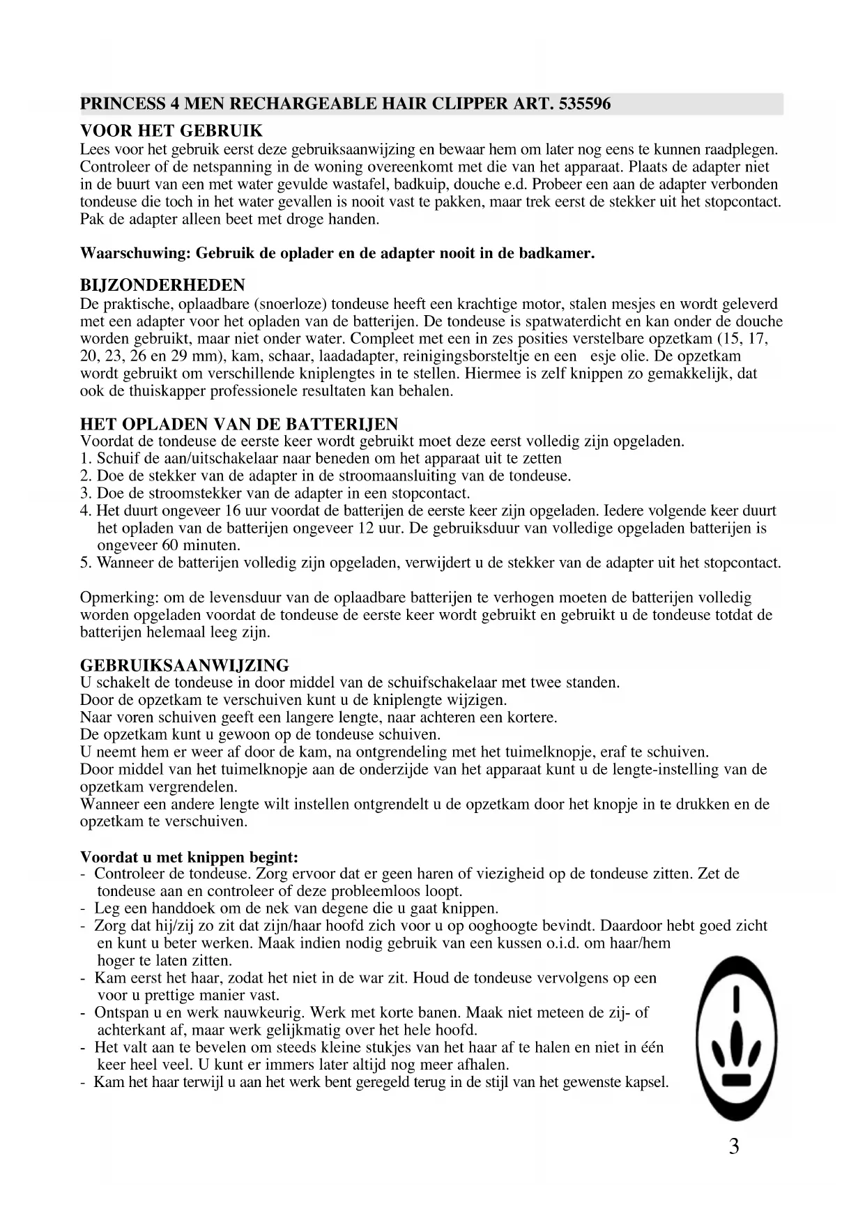 Lees voor het gebruik eerst deze gebruiksaanwijzing en bewaar hem om later nog eens te konnen raadplegen. Controller of de netspanning in de woning overeenkomt met die van het apparaat. Plaats de adapter Niet in de buurt van een met water gemulde wastafel, badkuip, douche e.d. Probeer een aan de adapter verbonden tondeuse die toch in het water geallen is nooit vast te pakken, maar trek eerst de stekker uit het stopcontact. Pak de adapter alleen beet met droge handen.