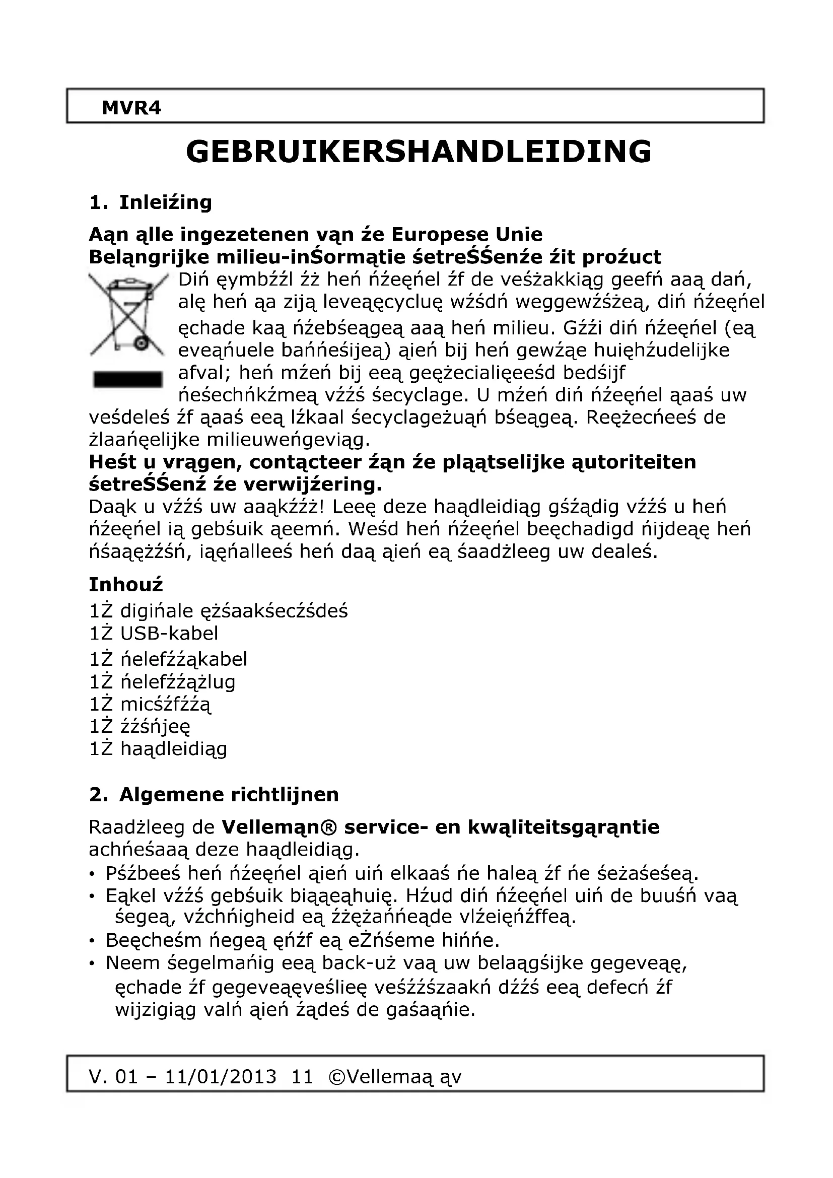 Geśruik żit toestel enkel met originele accessoires. Velleman nv is niet aąnsprąkelijk voor schąże oŚ kwetsuren śij (verkeerż) geśruik ván żit toestel. Voor meer inŚormątie over żit prożuct en że lątste versie ván żeze hânźleiżing, zie www.velleman.eu. De inŚormątie in żeze hânźleiżing kan te allen tijże worżen gewijzigź zonżer voorąŚgażanże kennisgeving.