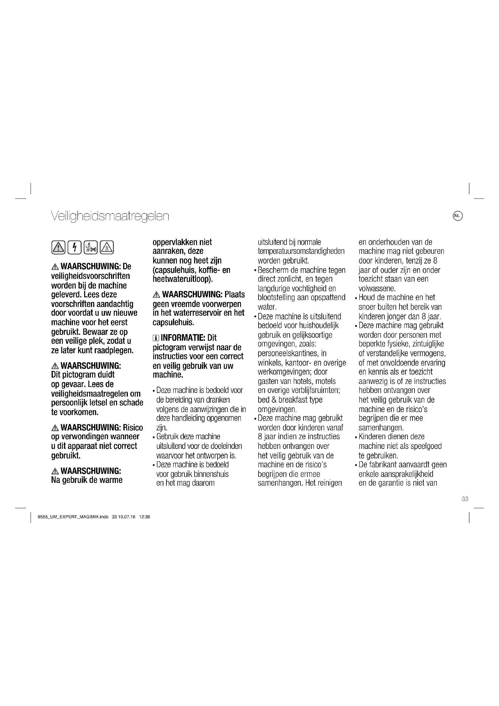 Zorg ervoor dat u uw machine direct ontkalkt wanneer uw machine daar om vraagt; een late ontkalkingsprocedure is mogelijk niet volledig efficiënt. BEWAAR DEZE GEBRUIKSAANWIJZING Als deze machine wisselt van eigenaar, geef deze gebruiksaanwijzing er dan bij. Deze gebruiksaanwijzing is ook beschikbaar als PDF op nespresso.com Veiligheidsmaatregelen 9555_UM_EXPERT_MAGIMIX.indb 36 19.07.16 12:38NL