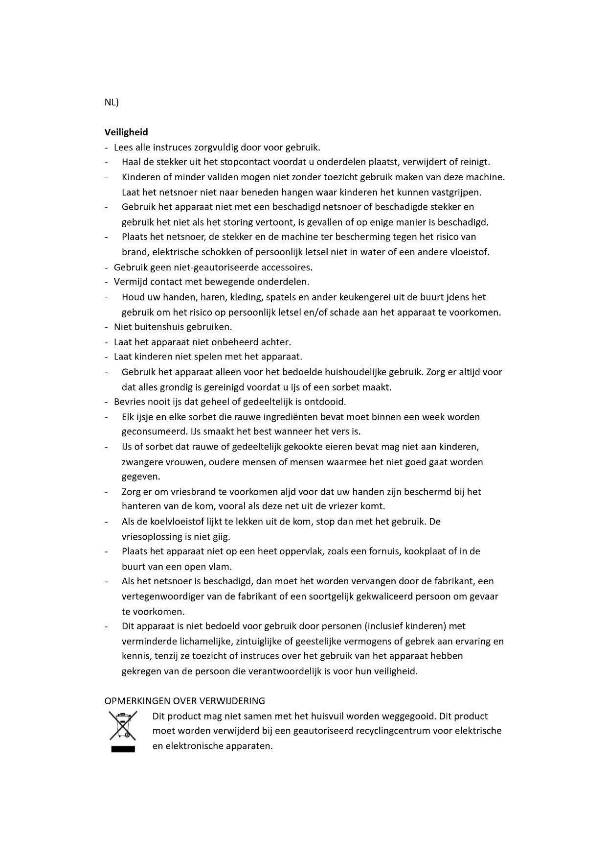 - Gebruik het apparaat alleen voor het bedoelde huishoudelijk gebruik. Zorg er.altijd voor dat alles grondig is gereinigd voordat u ijds of een sorbet maakt.