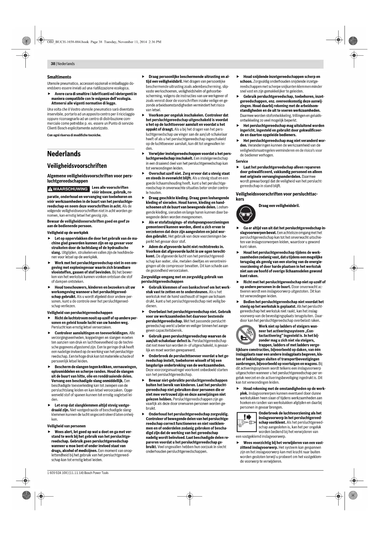 Gewicht volgens EPTA-Procedure 01/2003 kg 1,14 1,14 OBJ_BUCH-1038-004.book Page 39 Tuesday, November 11, 2014 2:36 PM1 609 92A 10X | (11.11.14) Bosch Power Tools 40 | Nederlands Montage Aansluiting op de luchttoevoer (zie afbeelding A) Controleer dat de druk van de persluchtinstallatie niet gro- ter is dan de maximaal toegestane nominale druk van het persluchtgereedschap. Stel de luchtdruk eerst in op de on- derste waarde van de geadviseerde nominale druk (zie „Technische gegevens”). Controleer in geval van twijfel de druk bij de luchtingang met een manometer terwijl het persluchtgereedschap in- geschakeld is. Voor een maximaal vermogen moeten de waarden voor de luchttoevoerslang 17 (aansluitschroefdraad, maximale be- drijfsdruk, slangbinnendiameter, maximale slanglengte; zie „Technische gegevens”) worden aangehouden. De toegevoerde perslucht moet vrij van voorwerpen en vocht zijn om het persluchtgereedschap te beschermen te- gen beschadiging, vervuiling en roestvorming. Alle armaturen, verbindingsleidingen en slangen moeten geschikt zijn voor de druk en de vereiste luchthoeveelheid. Voorkom vernauwingen van de toevoerleidingen, bijvoor- beeld door afknellen, knikken of trekken. Aansluiting van de persluchttoevoer op het perslucht- gereedschap – Maak het magazijn 8 leeg. (zie „Magazijn leegmaken”, pagina 40) Bij de volgende handelingen kan een inslagvoorwerp uitgestoten worden als door reparatie- of onderhouds- werkzaamheden of transport inwendige delen van het persluchtgereedschap zich niet in de uitgangspositie bevinden. – Verbind het luchtaansluitstuk 6 met een luchttoevoer- slang 17 die is uitgerust met een snelsluitkoppeling 16. – Controleer de juiste werking door het persluchtgereed- schap met de monding 13 of indien nodig met de rubber werkstukbescherming 1 op een houten plank of plaat neer te zetten en één tot twee keer te activeren. Magazijn vullen Onderbreek de luchttoevoer voordat u het persluchtgereedschap instelt, toe- behoren vervangt of het gereedschap weglegt. Deze voorzorgsmaatregel voor- komt onbedoeld starten van het perslucht- gereedschap. Gebruik alleen origineel Bosch-toebehoren (zie „Technische gegevens”). De precisieonderdelen van de tacker, zoals magazijn, monding en nietkanaal, zijn afgestemd op nieten, nagels en stiften van Bosch. Ande- re fabrikanten gebruiken andere staalkwaliteiten en af- metingen. Het gebruik van ongeoorloofde inslagvoorwerpen kan het persluchtgereedschap beschadigen en kan verwon- dingen veroorzaken. Houd het persluchtgereedschap tijdens het vullen van het magazijn zodanig dat de monding 13 niet op uw eigen li- chaam of op andere personen gericht is. GTK 40 (zie afbeeldingen B1–B2) –Trek de magazijnschuif 11 terug totdat de knop van de blokkering van de magazijnschuif 7 volledig vastklikt. – Reinig en smeer de magazijnschuif 11 indien nodig en controleer dat het magazijn 8 niet vuil is. – Stulp een passende nietstrip 18 over het magazijn 8. De nietkoppen moeten daarbij geheel op het oppervlak van het magazijn liggen en de nietstrip moet gemakke- lijk in het magazijn heen en weer kunnen worden ge- schoven. –Trek de magazijnschuif 11 iets terug en duw de knop van de blokkering van de magazijnschuif 7 naar binnen. – Beweeg de magazijnschuif voorzichtig naar voren tot deze de nietstrip raakt. Opmerking: Laat de magazijnschuif niet terugschieten zonder deze vast te houden. Anders kan de magazijnschuif beschadigd worden. Bovendien bestaat het gevaar dat uw vingers worden vastgeklemd. GSK 50 (zie afbeeldingen C1–C2) – Druk op de magazijnblokkering 14 en trek tegelijkertijd het magazijn 8 tot aan de aanslag naar achteren. – Reinig en smeer indien nodig de magazijnrail 20. – Leg een passende nagelstrip 19 in het magazijn. De nagelpunten dienen daarbij indien mogelijk de maga- zijnrail 20 te raken. – Duw de nagelstrips in het magazijn helemaal naar voren. – Duw het magazijn naar binnen tot de magazijnblokke- ring 14 weer vastklikt. Vul het magazijn als de rode balken van de vulindicatie 15 voor de helft zichtbaar zijn. Gebruik Activeringssystemen Het persluchtgereedschap kan met twee verschillende ac- tiveringssystemen worden gebruikt: – Enkele inslag met beveiligingsreeks Bij dit activeringssysteem moet eerst de activeringsbe- veiliging 2 stevig op het werkstuk worden gezet. Een in- slagvoorwerp wordt pas uitgestoten als de schakelaar 10 wordt ingedrukt. Nieuwe inslagen zijn daarna pas mogelijk nadat de scha- kelaar en de activeringsbeveiliging weer in de uitgangs- positie zijn gezet. – Contactactivering Bij dit activeringssysteem moet eerst de schakelaar 10 worden ingedrukt. Een inslagvoorwerp wordt altijd uit- gestoten als de activeringsbeveiliging 2 stevig op het werkstuk wordt gezet terwijl de schakelaar is ingedrukt. Daarmee wordt een hogere werksnelheid bereikt. Voor het instellen van het activeringssysteem dient de om- schakelaar 9. Ingebruikneming Onderbreek de luchttoevoer voordat u het persluchtgereedschap instelt, toe- behoren vervangt of het gereedschap weglegt. Deze voorzorgsmaatregel voor- komt onbedoeld starten van het perslucht- gereedschap. Werkzaamheden met enkele inslag (zie afbeelding D) – Druk de omschakelaar 9 naar binnen en klap deze tege- lijkertijd in de onderste stand tot hij weer vastklikt. Het activeringssysteem „en- kele inslag” is ingesteld. – Laat de omschakelaar 9 weer los. –Zet de monding 13 of indien nodig de rubber werkstuk- bescherming 1 stevig op het werkstuk tot de active- ringsbeveiliging 2 helemaal is ingedrukt. – Druk vervolgens de schakelaar 10 kort in en laat deze weer los. Daarbij wordt een niet (GTK 40) of een platkopnagel (GSK 50) uitgeschoten. – Laat het persluchtgereedschap van het werkstuk terug- stuiten. – Voor een nieuwe inslag tilt u het helemaal van het werk- stuk omhoog en zet u het weer neer op de volgende plaats waar u een inslag wenst. Werkzaamheden met contactactivering (zie afbeelding E) – Druk de omschakelaar 9 naar binn