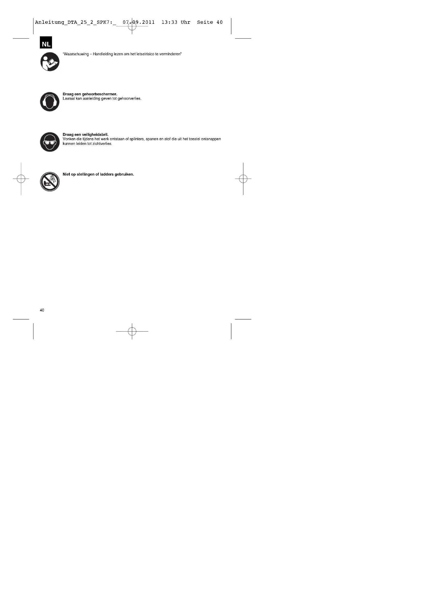 “Waarschuwing – Handleiding lezen om het letselrisico te verminderen” Draag een gehoorbeschermer. Lawaai kan aanleiding geven tot gehoorverlies. Draag een veiligheidsbril. Vonken die tijdens het werk ontstaan of splinters, spanen en stof die uit het toestel ontsnappen kunnen leiden tot zichtverlies. Niet op stellingen of ladders gebruiken. Anleitung_DTA_25_2_SPK7:_ 07.09.2011 13:33 Uhr Seite 40 Let op! Bij het gebruik van toestellen dienen enkele veiligheidsmaatregelen te worden nageleefd om lichamelijk gevaar en schade te voorkomen. Lees daarom deze handleiding zorgvuldig door. Bewaar deze goed zodat u de informatie op elk moment kunt terugvinden. Mocht u dit apparaat aan andere personen doorgeven, gelieve dan deze handleiding mee te geven. Wij zijn niet aansprakelijk voor ongevallen of schade die te wijten zijn aan niet- naleving van deze handleiding en van de veiligheidsinstructies.