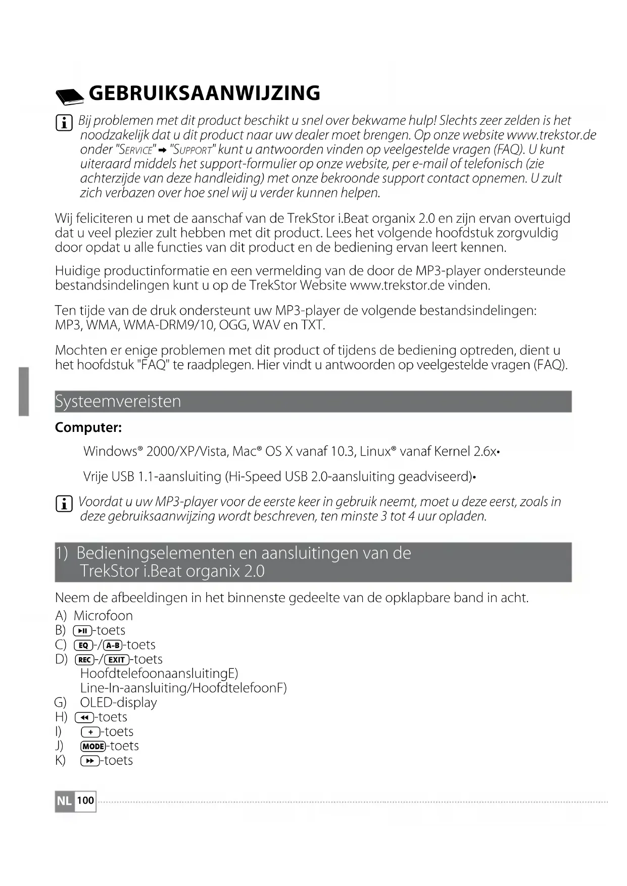 Bij problemen met dit product beschikt u snel over bekwame hulp! Slechts zeer zelden is het noodzakelijk dat u dit product naar uw dealer moet brengen. Op onze website www.trekstor.de onder "Se r v i c e " + "Su p p o r t " kunt u antwoorden vinden op veelgestelde vragen (FAQ). U kunt uiteraard middels het support-formulier op onze website, per e-mail of telefonisch (zie achterzijde van deze handleiding) met onze bekroonde support contact opnemen. U zult zich verbazen over hoe snel wij u verder kunnen helpen. Wij feliciteren u met de aanschaf van de TrekStor i.Beat organix 2.0 en zijn ervan overtuigd dat u veel plezier zult hebben met dit product. Lees het volgende hoofdstuk zorgvuldig door opdat u alle functies van dit product en de bediening ervan leert kennen. Huidige productinformatie en een vermelding van de door de MP3-player ondersteunde bestandsindelingen kunt u op de TrekStor Website www.trekstor.de vinden. Ten tijde van de druk ondersteunt uw MP3-player de volgende bestandsindelingen: MP3, WMA, WMA-DRM9/10, OGG, WAV en TXT. Mochten er enige problemen met dit product of tijdens de bediening optreden, dient u het hoofdstuk "FAQ" te raadplegen. Hier vindt u antwoorden op veelgestelde vragen (FAQ). Systeemvereisten Computer: Windows® 2000/XP/Vista, Mac® OS X vanaf 10.3, Linux® vanaf Kernel 2.6x• Vrije USB 1.1-aansluiting (Hi-Speed USB 2.0-aansluiting geadviseerd)•