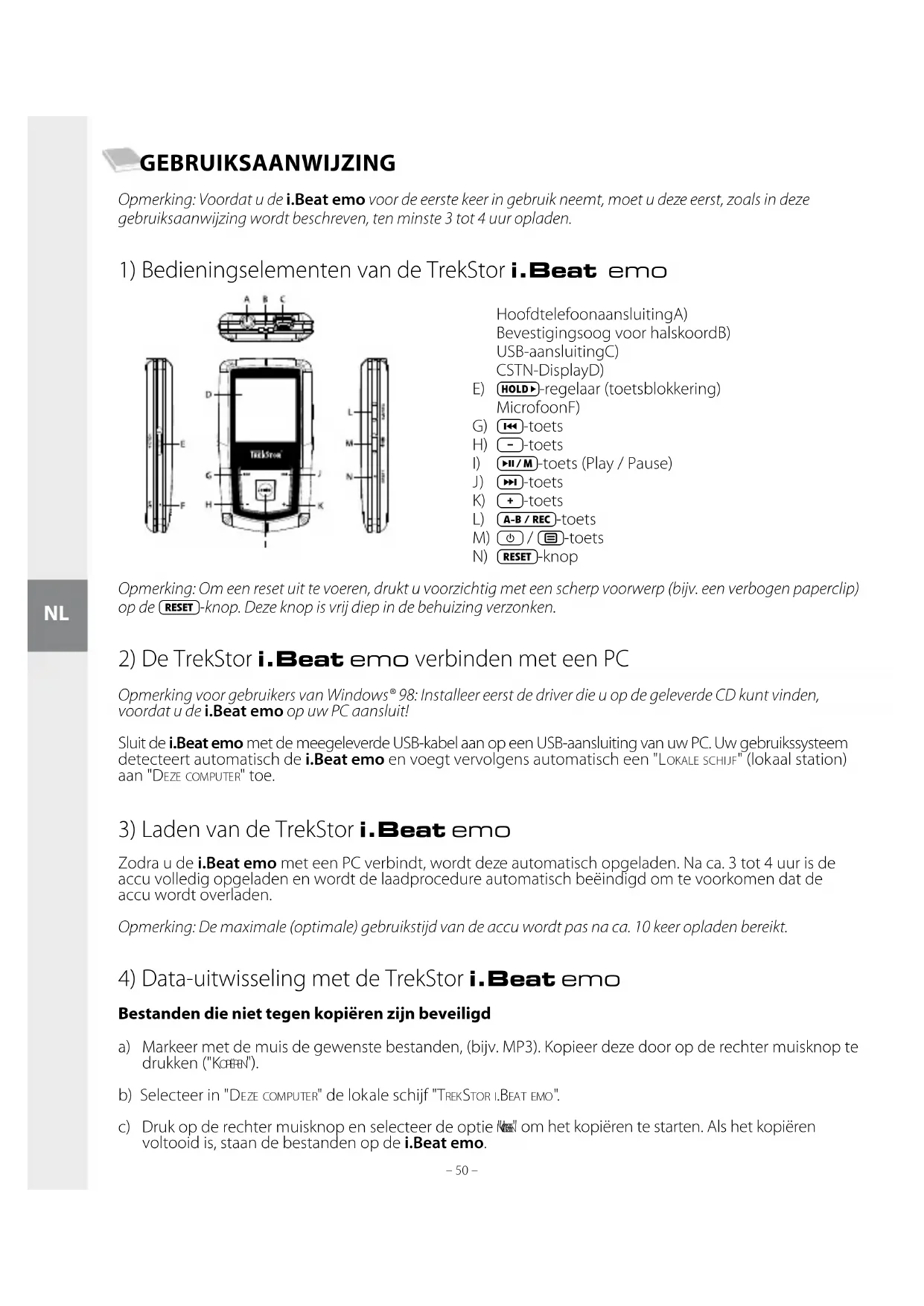– 51 – GEBRUIKSAANWIJZING Opmerking: Voordat u de i.Beat emo voor de eerste keer in gebruik neemt, moet u deze eerst, zoals in deze gebruiksaanwijzing wordt beschreven, ten minste 3 tot 4 uur opladen.