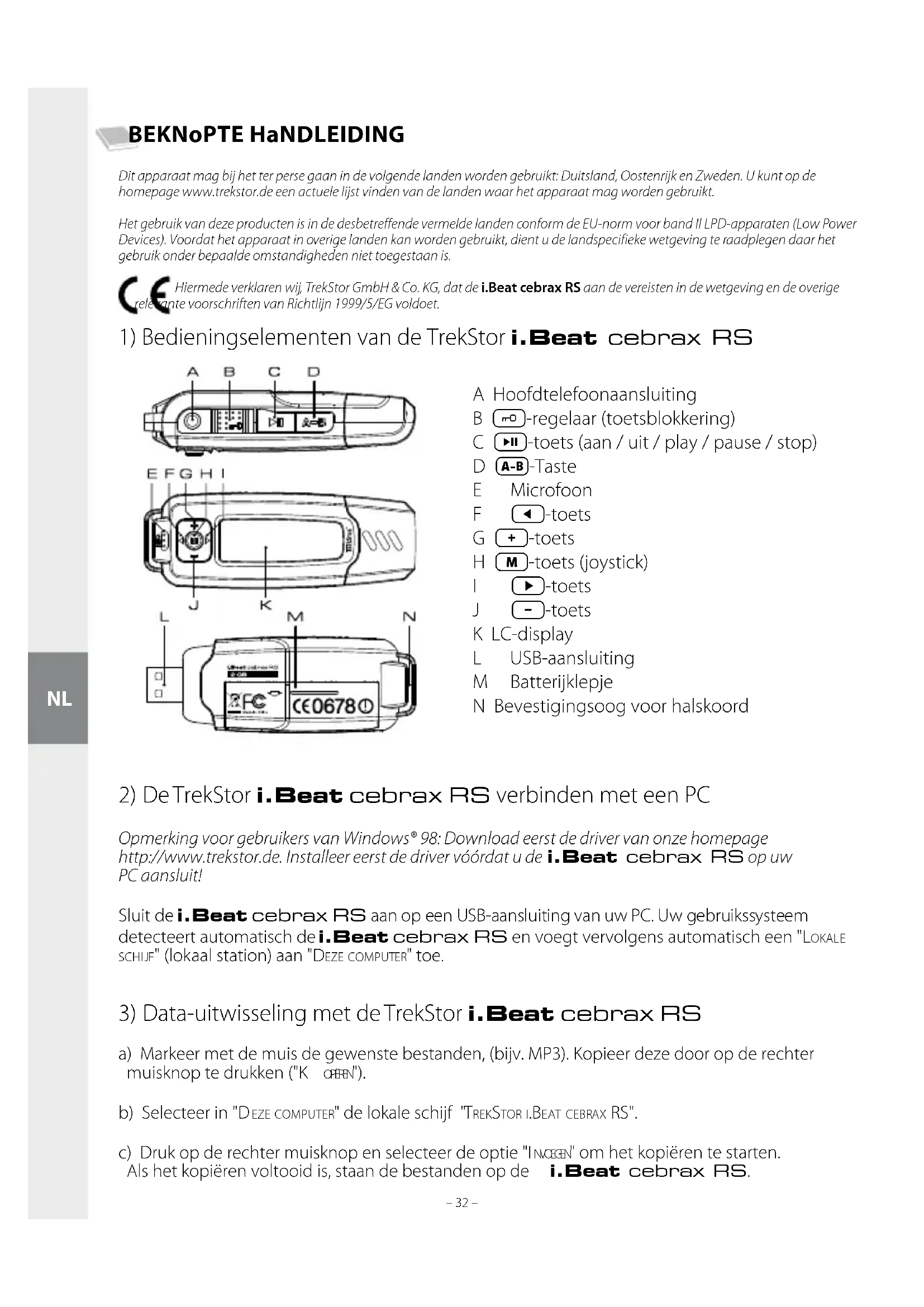 a) Markeer met de muis de gewenste bestanden, (bijv. MP3). Kopieer deze door op de rechter muisknop te drukken ("K o p i ë r e n "). b) Selecteer in "d e z e c o m p u t e r " de lokale schijf "tr e K st o r i.be A t c e b r A x rs". c) Druk op de rechter muisknop en selecteer de optie "i n v o e g e n " om het kopiëren te starten. Als het kopiëren voltooid is, staan de bestanden op de i.Beat cebrax RS. A Hoofdtelefoonaansluiting B -regelaar (toetsblokkering) C -toets (aan / uit / play / pause / stop) D -Taste E Microfoon F -toets G -toets H -toets (joystick) I -toets J -toets K LC-display L USB-aansluiting M Batterijklepje N Bevestigingsoog voor halskoord NL– 32 – – 33 –