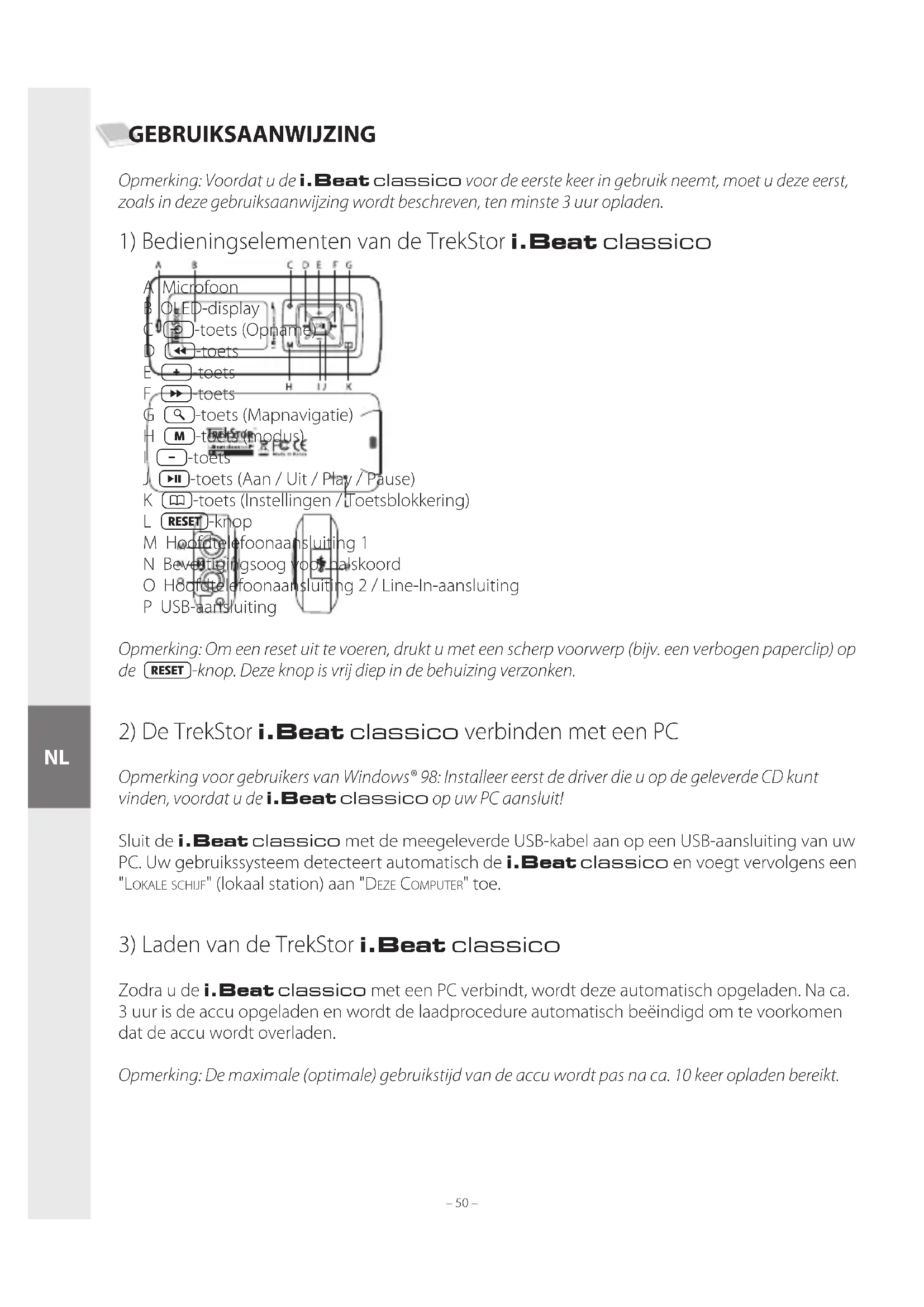 Zodra u de i.Beat classico met een PC verbindt, wordt deze automatisch opgeladen. Na ca. 3 uur is de accu opgeladen en wordt de laadprocedure automatisch beëindigd om te voorkomen dat de accu wordt overladen. Opmerking: De maximale (optimale) gebruikstijd van de accu wordt pas na ca. 10 keer opladen bereikt. NL– 51 – – 51 –