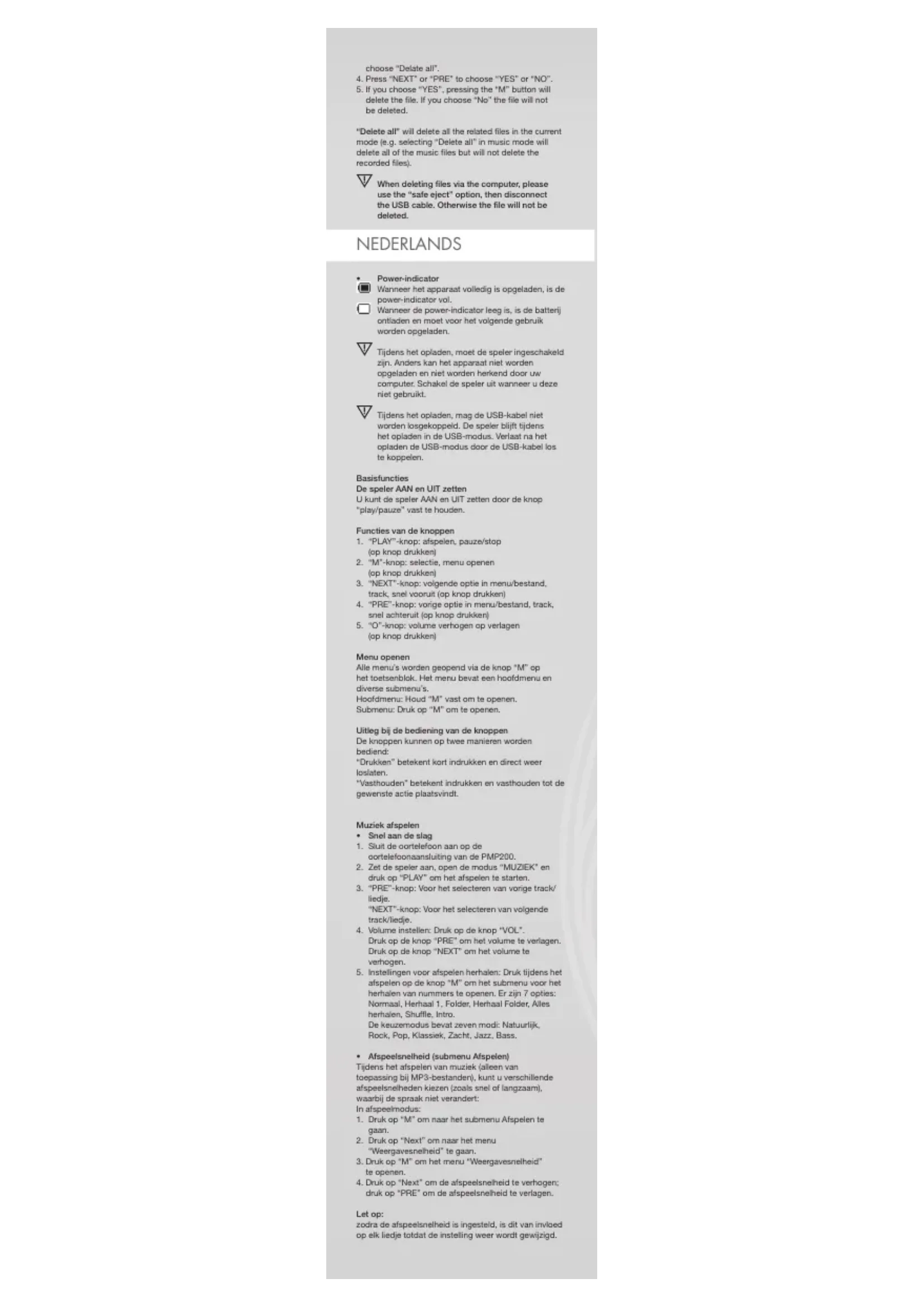 - Power-indicator Wanneer het apparaat volledig is opgeladen, is de power-indicator vol. Wanneer de power-indicator leeg is, is de batterij ontladen en moet voor het volgende gebruik worden opgeladen. Tijdens het opladen, moet de speler ingeschakeld zijn. Anders kan het apparaat niet worden opgeladen en niet worden herkend door uw computer. Schakel de speler uit wanneer u deze niet gebruikt. Tijdens het opladen, mag de USB-kabel niet worden losgekoppeld. De speler blijft tijdens het opladen in de USB-modus. Verlaat na het opladen de USB-modus door de USB-kabel los te koppelen. Basisfuncties De speler AAN en UIT zetten U kunt de speler AAN en UIT zetten door de knop “play/pauze” vast te houden. Functies van de knoppen