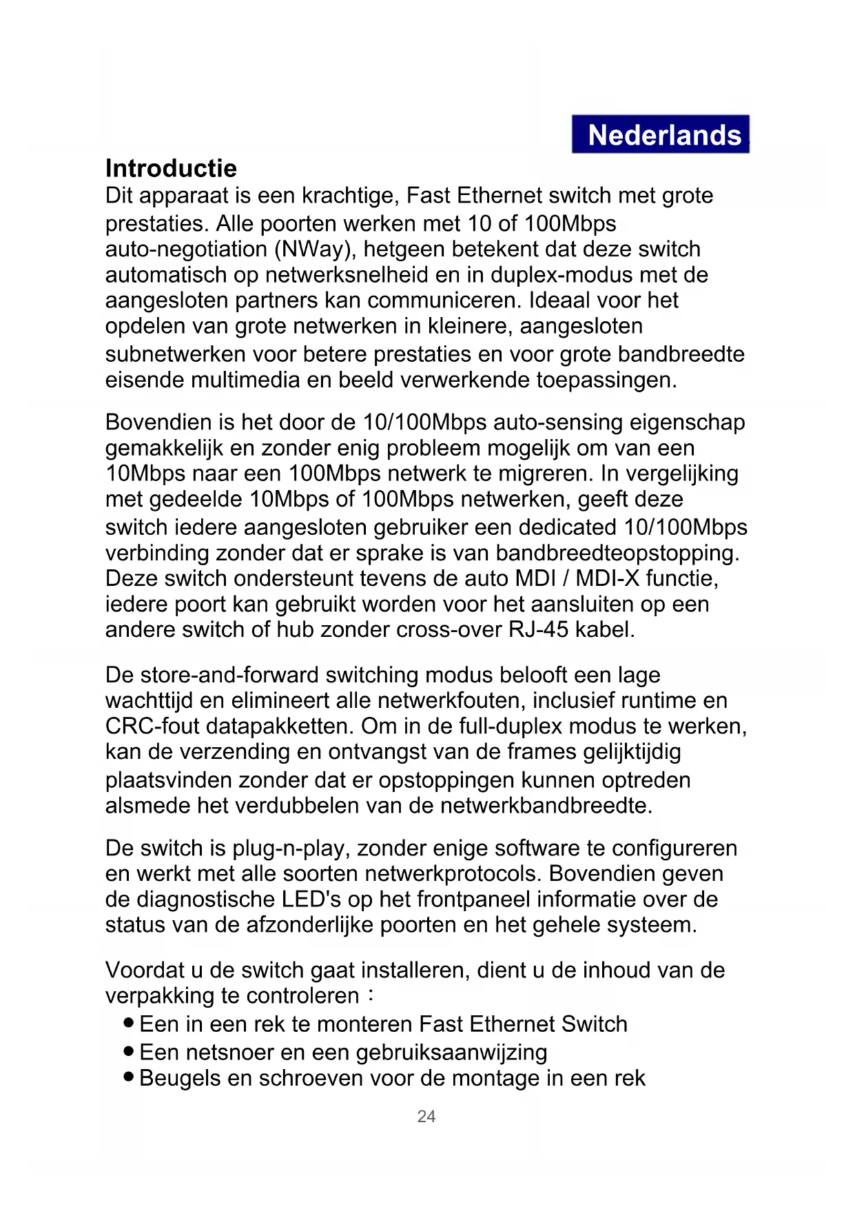 23Nederlands. Introductie Dit apparaat is een krachtige, Fast Ethernet switch met grote prestaties. Alle poorten werken met 10 of 100Mbps auto-negotiation (NWay), hetgeen betekent dat deze switch automatisch op netwerksnelheid en in duplex-modus met de aangesloten partners kan communiceren. Ideaal voor het opdelen van grote netwerken in kleinere, aangesloten subnetwerken voor betere prestaties en voor grote bandbreedte eisende multimedia en beeld verwerkende toepassingen. Bovendien is het door de 10/100Mbps auto-sensing eigenschap gemakkelijk en zonder enig probleem mogelijk om van een 10Mbps naar een 100Mbps netwerk te migreren. In vergelijking met gedeelde 10Mbps of 100Mbps netwerken, geeft deze switch iedere aangesloten gebruiker een dedicated 10/100Mbps verbinding zonder dat er sprake is van bandbreedteopstopping. Deze switch ondersteunt tevens de auto MDI / MDI-X functie, iedere poort kan gebruikt worden voor het aansluiten op een andere switch of hub zonder cross-over RJ-45 kabel. De store-and-forward switching modus belooft een lage wachttijd en elimineert alle netwerkfouten, inclusief runtime en CRC-fout datapakketten. Om in de full-duplex modus te werken, kan de verzending en ontvangst van de frames gelijktijdig plaatsvinden zonder dat er opstoppingen kunnen optreden alsmede het verdubbelen van de netwerkbandbreedte. De switch is plug-n-play, zonder enige software te configureren en werkt met alle soorten netwerkprotocols. Bovendien geven de diagnostische LED's op het frontpaneel informatie over de status van de afzonderlijke poorten en het gehele systeem. Voordat u de switch gaat installeren, dient u de inhoud van de verpakking te controleren:
