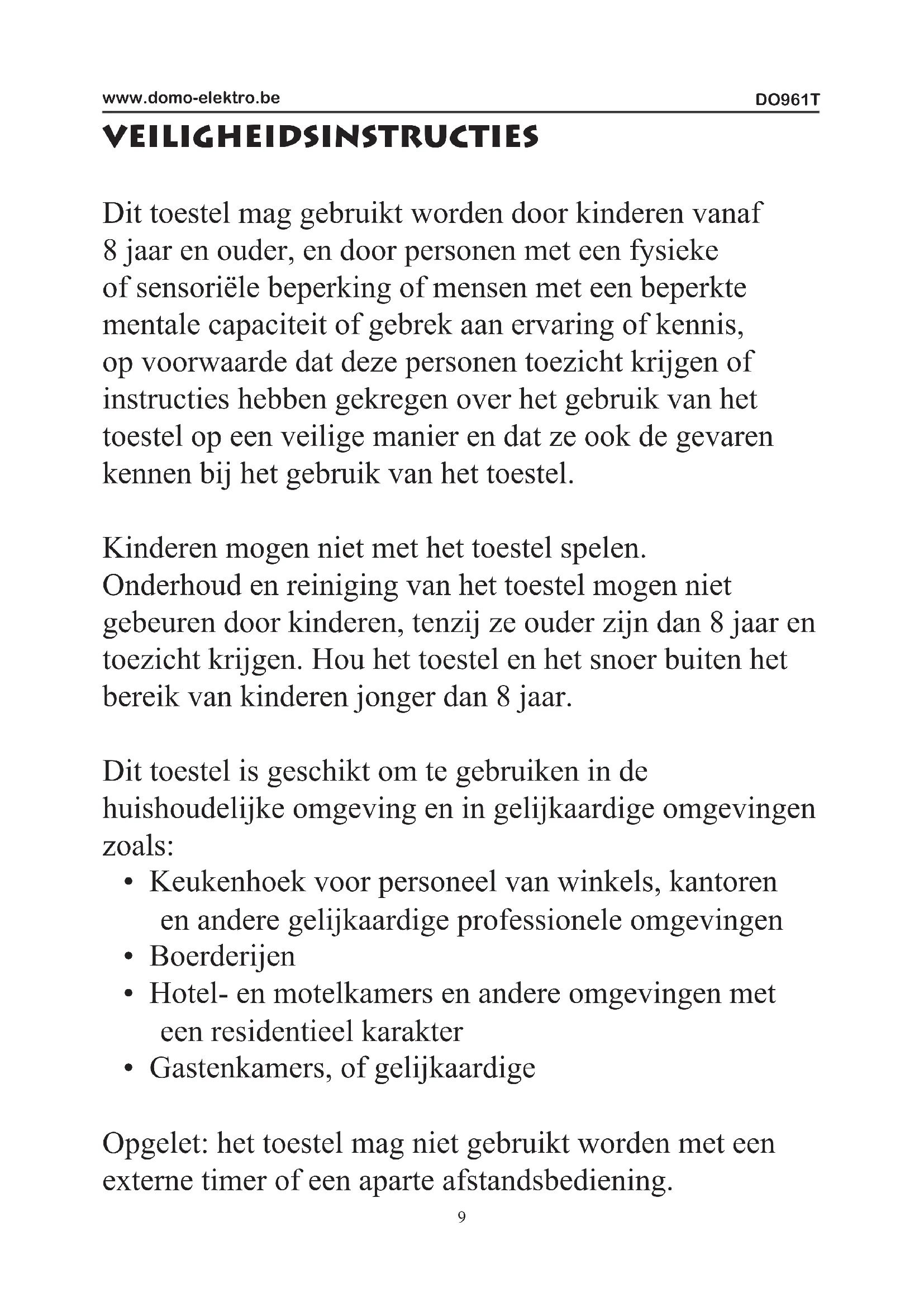 www.domo-elektro.be VEILIGHEIDSINSTRUCTIES Dit toestel mag gebruikt worden door kinderen vanaf 8 jaar en ouder, en door personen met een fysieke of sensoriële beperking of mensen met een beperkte mentale capaciteit of gebrek aan ervaring of kennis, op voorwaarde dat deze personen toezicht krijgen of instructies hebben gekregen over het gebruik van het toestel op een veilige manier en dat ze ook de gevaren kennen bij het gebruik van het toestel. Kinderen mogen niet met het toestel spelen. Onderhoud en reiniging van het toestel mogen niet gebeuren door kinderen, tenzij ze ouder zijn dan 8 jaar en toezicht krijgen. Hou het toestel en het snoer buiten het bereik van kinderen jonger dan 8 jaar. Dit toestel is geschikt om te gebruiken in de huishoudelijke omgeving en in gelijkaardige omgevingen zoals: