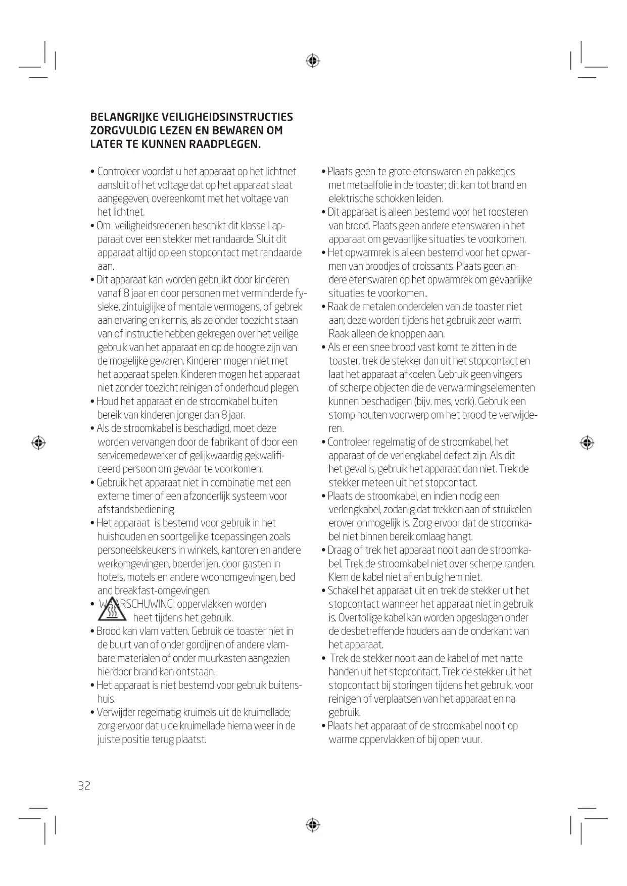 - Dit apparaat is alleen bestemd voor het roosteren van brood. Plaats geen andere etenswaren in het apparaat om gevaarlijke situaties te voorkomen.