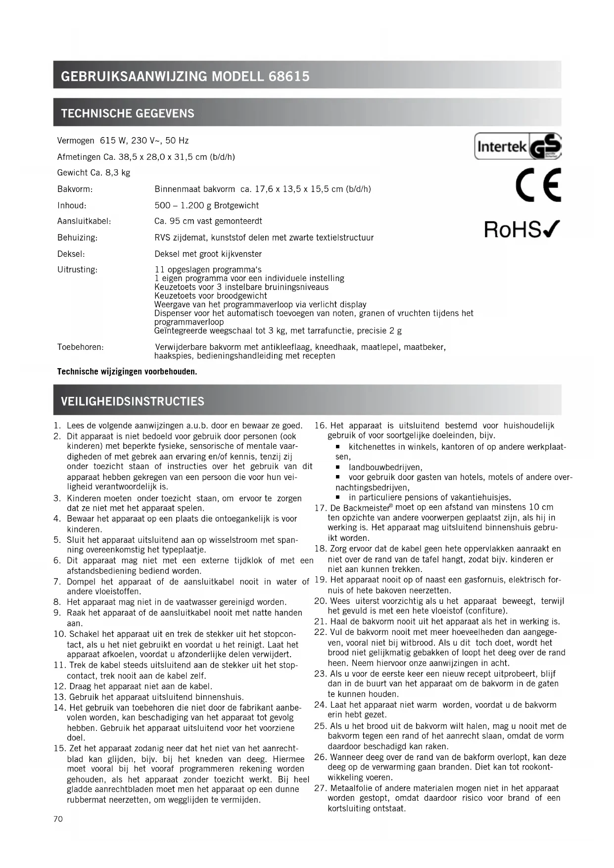 worden gestopt, omdat daardoor risico voor brand of een kortsluiting ontstaat. Vermogen 615 W, 230 V~, 50 Hz Afmetingen Ca. 38,5 x 28,0 x 31,5 cm (b/d/h) Gewicht Ca. 8,3 kg Bakvorm: Binnenmaat bakvorm ca. 17,6 x 13,5 x 15,5 cm (b/d/h) Inhoud: 500 – 1.200 g Brotgewicht Aansluitkabel: Ca. 95 cm vast gemonteerdt Behuizing: RVS zijdemat, kunststof delen met zwarte textielstructuur Deksel: Deksel met groot kijkvenster Uitrusting: 11 opgeslagen programma‘s 1 eigen programma voor een individuele instelling Keuzetoets voor 3 instelbare bruiningsniveaus Keuzetoets voor broodgewicht Weergave van het programmaverloop via verlicht display Dispenser voor het automatisch toevoegen van noten, granen of vruchten tijdens het programmaverloop Geïntegreerde weegschaal tot 3 kg, met tarrafunctie, precisie 2 g Toebehoren: Verwijderbare bakvorm met antikleeflaag, kneedhaak, maatlepel, maatbeker, haakspies, bedieningshandleiding met recepten technische wijzigingen voorbehouden.71
