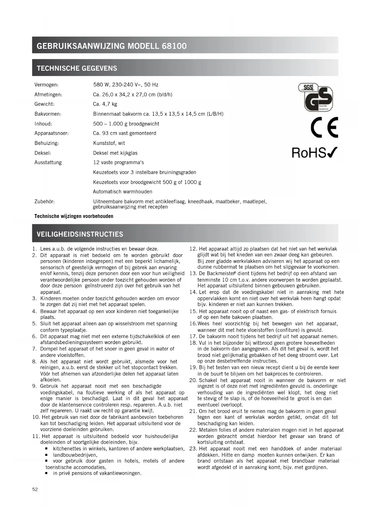 afdekken. Hitte en damp moeten kunnen ontwijken. Er kan brand ontstaan als het apparaat met brandbaar materiaal wordt afgedekt of in aanraking komt, bijv. met gordijnen. Vermogen: 580 W, 230-240 V~, 50 Hz Afmetingen: Ca. 26,0 x 34,2 x 27,0 cm (b/d/h) Gewicht: Ca. 4,7 kg Bakvormen: Binnenmaat bakvorm ca. 13,5 x 13,5 x 14,5 cm (L/B/H) Inhoud: 500 – 1.000 g broodgewicht Apparaatsnoer: Ca. 93 cm vast gemonteerd Behuizing: Kunststof, wit Deksel: Deksel met kijkglas Ausstattung 12 vaste programma‘s Keuzetoets voor 3 instelbare bruiningsgraden Keuzetoets voor broodgewicht 500 g of 1000 g Automatisch warmhouden Zubehör: Uitneembare bakvorm met antikleeflaag, kneedhaak, maatbeker, maatlepel, gebruiksaanwijzing met recepten technische wijzingen voorbehouden53