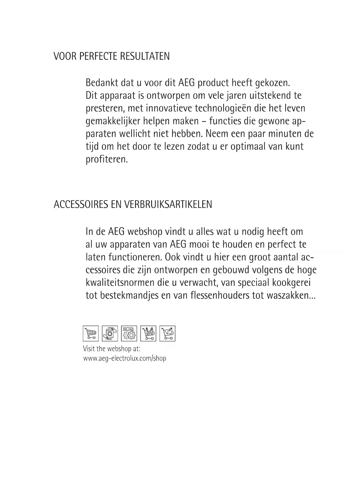 In de AEG webshop vindt u alles wat u nodig heeft om al uw apparaten van AEG mooi te houden en perfect te laten functioneren. Ook vindt u hier een groot aantal ac- cessoires die zijn ontworpen en gebouwd volgens de hoge kwaliteitsnormen die u verwacht, van speciaal kookgerei tot bestekmandjes en van flessenhouders tot waszakken… Visit the webshop at: www.aeg-electrolux.com/shopNL - ADVIEZEN EN SUGGESTIES