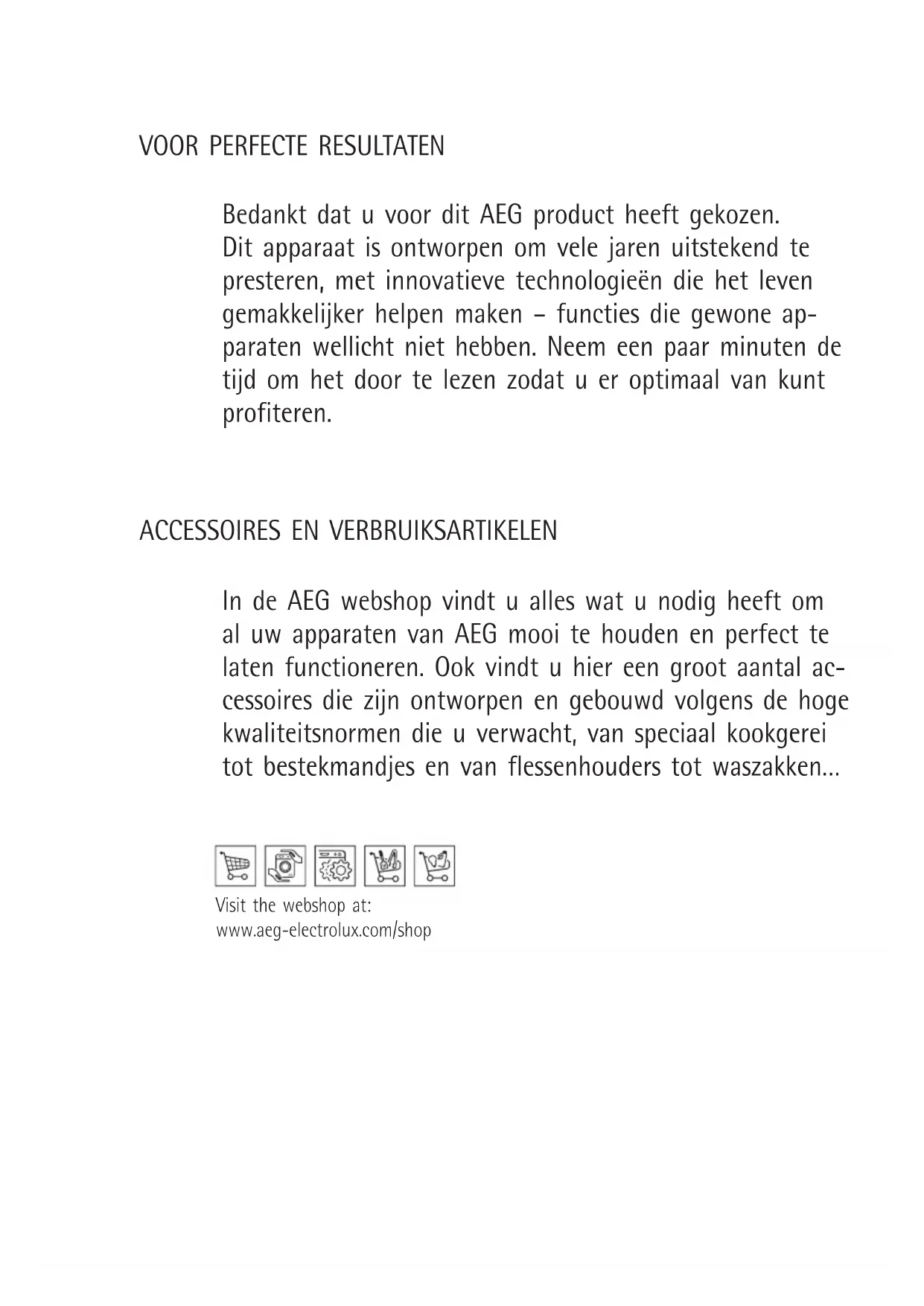 In de AEG webshop vindt u alles wat u nodig heeft om al uw apparaten van AEG mooi te houden en perfect te laten functioneren. Ook vindt u hier een groot aantal ac- cessoires die zijn ontworpen en gebouwd volgens de hoge kwaliteitsnormen die u verwacht, van speciaal kookgerei tot bestekmandjes en van flessenhouders tot waszakken… Visit the webshop at: www.aeg-electrolux.com/shopNL - ADVIEZEN EN SUGGESTIES/EIGENSCHAPPEN