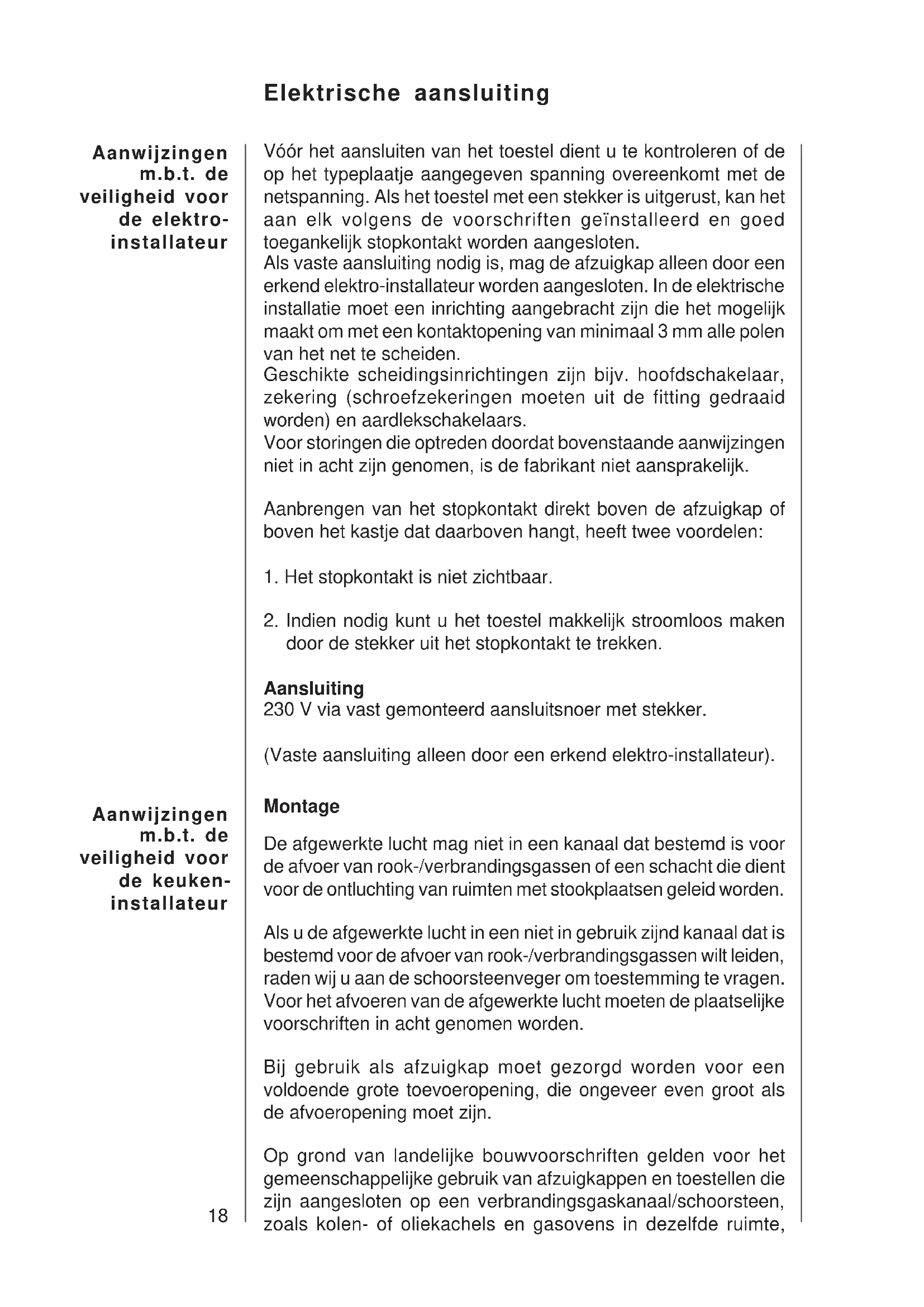 Als vaste aansluiting nodig is, mag de afzuigkap alleen door een erkend elektro-installateur worden aangesloten. In de elektrische installatie moet een inrichting aangebracht zijn die het mogelijk maakt om met een kontaktopening van minimaal 3 mm alle polen van het net te scheiden.
