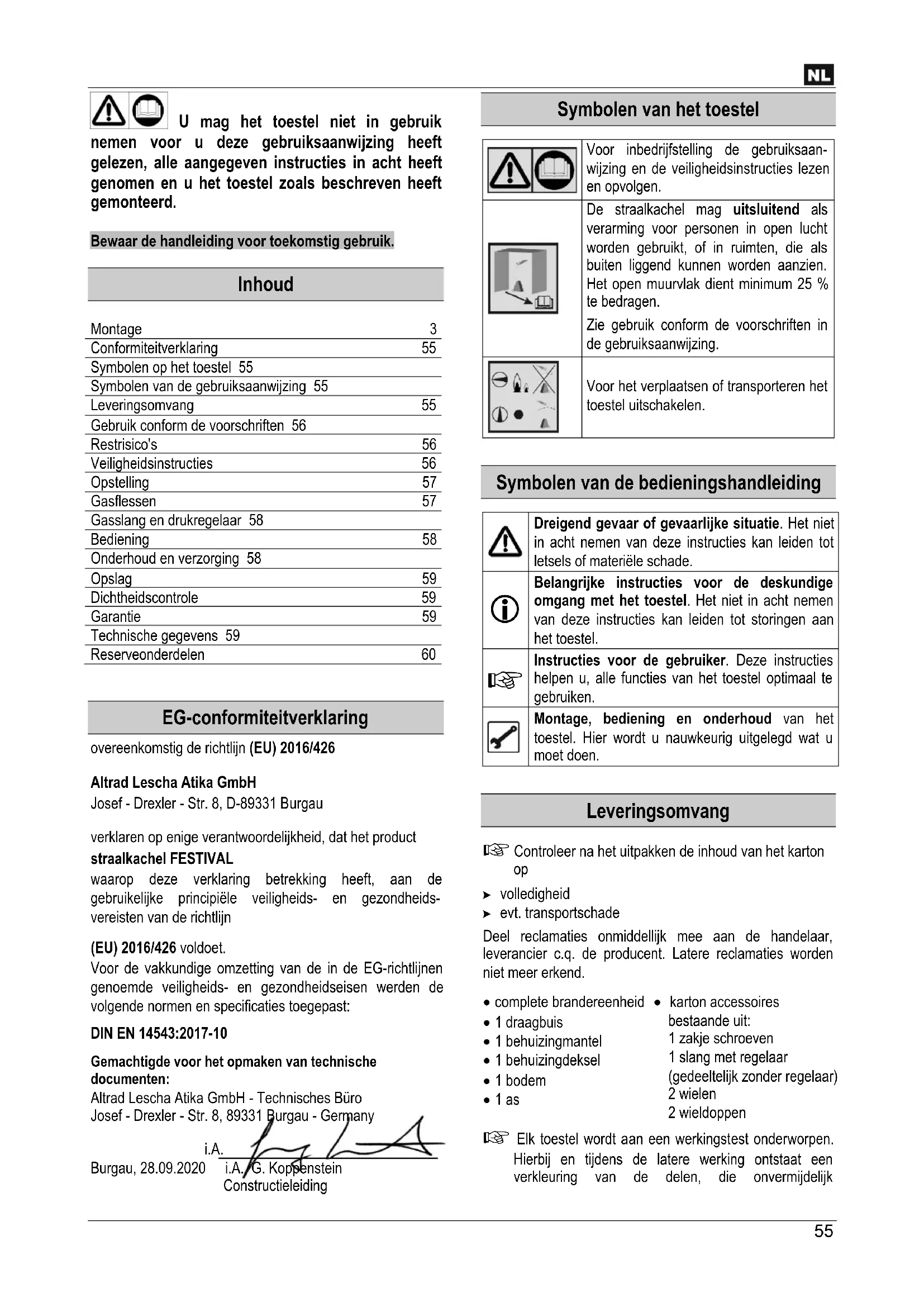 EG-conformiteitverklaring overeenkomstig de richtlijn (EU) 2016/426 Altrad Lescha Atika GmbH Josef - Drexler - Str. 8, D-89331 Burgau verklaren op enige verantwoordelijkheid, dat het product straalkachel FESTIVAL waarop deze verklaring betrekking heeft, aan de gebruikelijke principiële veiligheids- en gezondheids- vereisten van de richtlijn (EU) 2016/426 voldoet. Voor de vakkundige omzetting van de in de EG-richtlijnen genoemde veiligheids- en gezondheidseisen werden de volgende normen en specificaties toegepast: