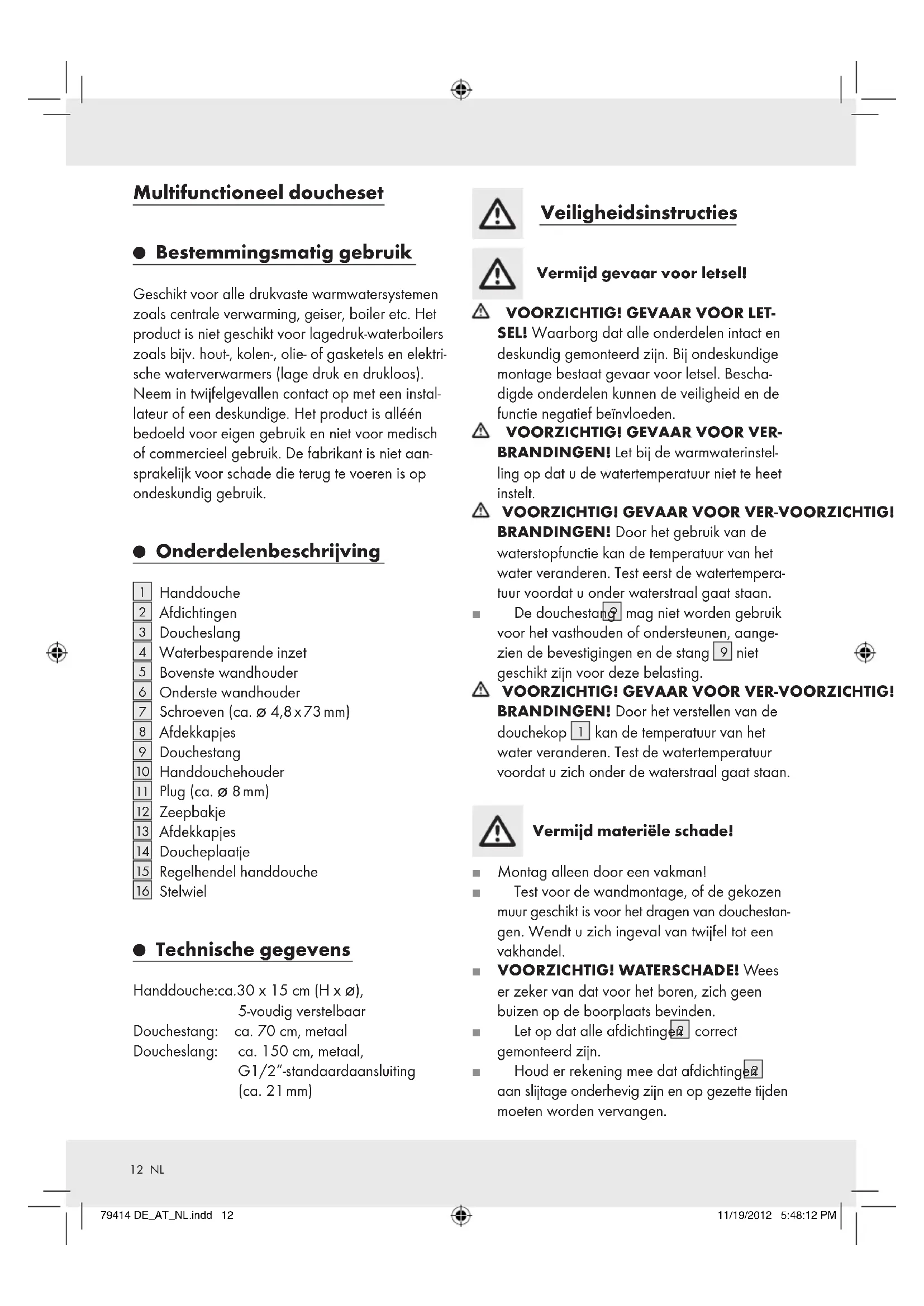 Technische gegevens Handdouche: ca. 30 x 15 cm (H x ø), 5-voudig verstelbaar Douchestang: ca. 70 cm, metaal Doucheslang: ca. 150 cm, metaal, G1/2“-standaardaansluiting (ca. 21 mm) Veiligheidsinstructies Vermijd gevaar voor letsel!