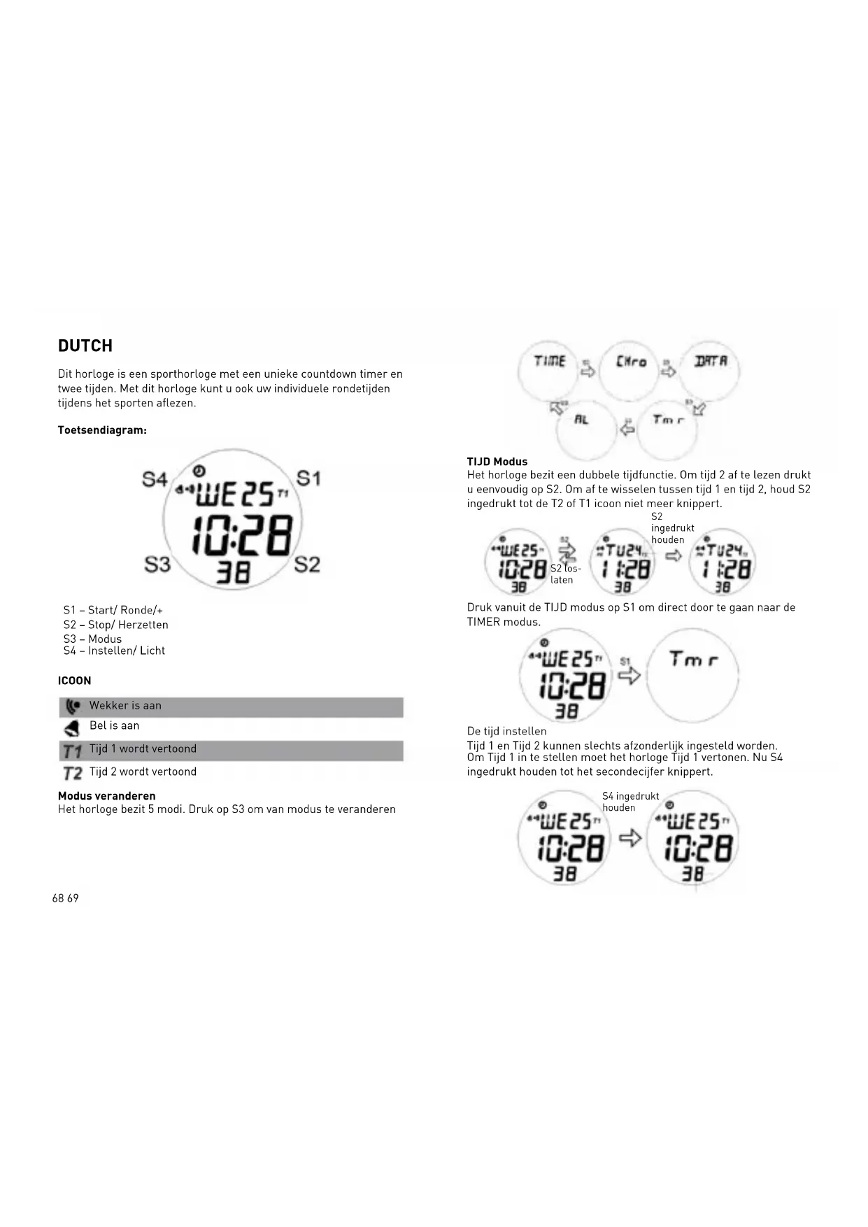 ingedrukt houden S4 ingedrukt houden DUTCH TIJD Modus Het horloge bezit een dubbele tijdfunctie. Om tijd 2 af te lezen drukt u eenvoudig op S2. Om af te wisselen tussen tijd 1 en tijd 2, houd S2 ingedrukt tot de T2 of T1 icoon niet meer knippert.70 71 CHRONOMETER Modus De chronometer modus voor dit horloge kan t/m 9 ronden opne- men. U kunt de tijd voor elke ronde in de DATA modus aflezen. S1 indrukken om de Chronometer timer te starten. S1 indrukken om het knipperende cijfer te verstellen. S1 nogmaals indrukken om een ronde of deeltijd op te nemen. S2 indrukken om de Chronometer timer stop te zetten.S2 nogmaals indrukken terwijl de chronometer timer niet loopt om de timer te herzetten. Wij maken u erop attent dat zodra de timer herzet wordt, alle data voor de desbetreffende wedloop niet langer in de DATA modus afgelezen kunnen worden. Volg dezelfde stappen als voor Tijd 1 om Tijd 2 in te stellen. Let op dat het horloge nu Tijd 2 vertoont. S2 indrukken om door te gaan naar de volgende optie. S3 of S4 indrukken om de tijdinstelling te verlaten. DAT A Modus Zolang de chronometer timer niet op nul is teruggezet, kunt u in deze modus de individuele ronde/deeltijd aflezen S1 indrukken om de verschillende ronden af te lezen. Druk op S4 of wacht 4 seconden om de deeltijd van de verschil- lende ronden af te lezen. Seconde 12/24 Uur Datum Maand Jaar Uur Minuut Weekdag Srart 4 Seconden of S4 indrukken 4 Seconden of S4 indrukken 4 Seconden of S4 indrukken LAP Spilt 4 Seconden of S4 indrukken72 73 TIMER Modus Het horloge bezit 3 verschillende timers: CD-S (Countdown Stop) CD-U (Countdown Optellen) and CD-R (Countdown Herhalen). De Timer moet voor het gebruik ingesteld worden. Houd hiervoor S4 ingedrukt tot u een knipperend cijfer ziet. S2 indrukken om door te gaan naar de volgende optie. S3 of S4 indrukken om de timer instellingen te verlaten. S3 of S4 indrukken om de timer instellingen te verlaten. De CD-S timer of countdown stop timer functioneert net als een normale countdown timer die stopt zodra hij nul bereikt. De CD-U of countdown optellen timer telt de ingestelde countdown tijd af en begint bij nul weer op te tellen tot de timer stopgezet wordt of 99:59’59 bereikt. Bij de CD-R of countdown herhaling wordt de ingestelde countdown tijd 30 keer herhaald of tot de timer stopgezet wordt. Alle 3 countdown timers geven een waarschuwingstoon van 5 pieptonen bij 5 minuten vóór nul, 2 pieptonen bij 2 minuten vóór nul, 1 pieptoon bij 1 minuut vóór nul en een 10 seconden pieptoon wanneer nul bereikt is. S1 indrukken om de timer te starten. S4 indrukken om de geselecteerde timer af te lezen. Uur Minuut CD-S/CD-U/CD-R74 75 WEKKER Modus Dit horloge bezit 2 dagelijkse wekkers die voor T1 of T2 ingesteld kunnen worden. S2 indrukken om de timer te stoppen. S4 indrukken terwijl de timer niet loopt om hem terug te zetten op de ingestelde waarde. S2 indrukken om Wekker 1 of 2 te selecteren. S1 indrukken om de geselecteerde wekker of bel in of uit te schakelen. Houd S4 ingedrukt tot de uurcijfers beginnen te knipperen om de geselecteerde wekker in te stellen. S1 indrukken om het knipperende cijfer te verstellen. S2 indrukken om door te gaan naar de volgende optie. Battery vervangen: Mocht het display verzwakken of geheel verdwijnen, dient u de batterij (CR2016) te vervangen. Raadpleeg hiervoor een bevoegd servicecentrum. S3 or S4 indrukken om de wekker instelling te verlaten. Wekker AAN & Bel AAN Wekker UIT & Bel UIT Wekker AAN Uur Minuut T1/T2 Bel AAN76 77