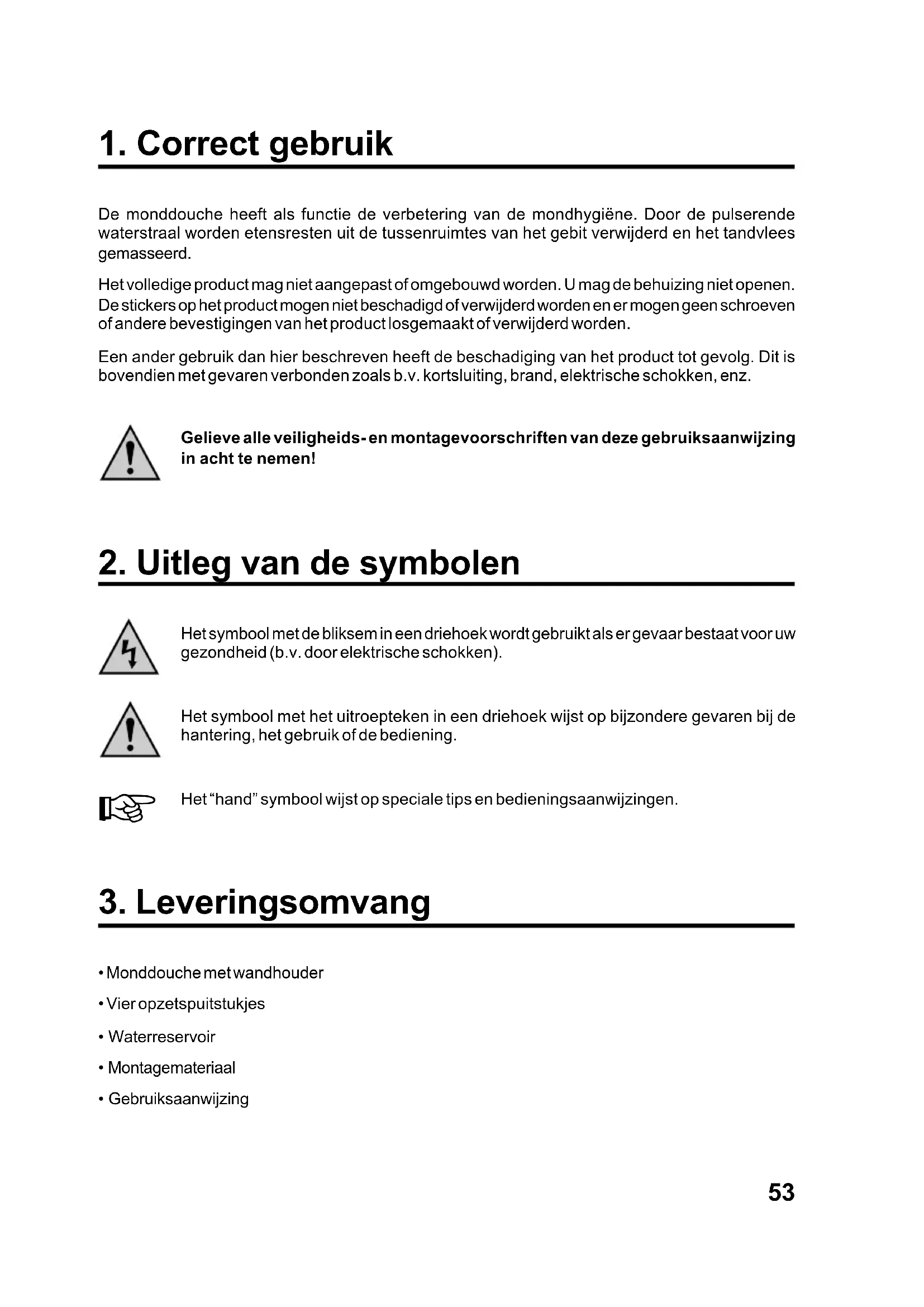 De monddouche heeft als functie de verbetering van de mondhygiëne. Door de pulserende waterstraal worden etensresten uit de tussenruimtes van het gebit verwijderd en het tandvlees gemasseerd. Het volledige product mag niet aangepast of omgebouwd worden. U mag de behuizing niet openen. De stickers op het product mogen niet beschadigd of verwijderd worden en er mogen geen schroeven of andere bevestigingen van het product losgemaakt of verwijderd worden. Een ander gebruik dan hier beschreven heeft de beschadiging van het product tot gevolg. Dit is bovendien met gevaren verbonden zoals b.v. kortsluiting, brand, elektrische schokken, enz. Gelieve alle veiligheids- en montagevoorschriften van deze gebruiksaanwijzing in acht te nemen!