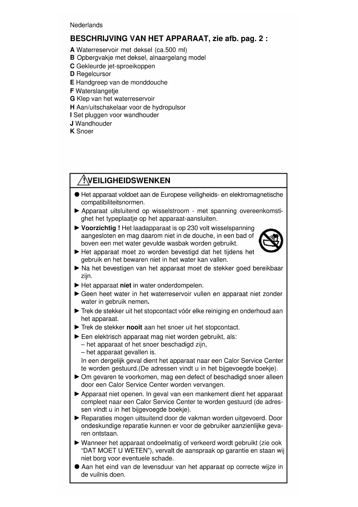 j Rincer les canules à fond à l’eau chaude après chaque utilisation. j Les égoutter ou les essuyer avant leur remise en place. j Essuyer si nécessaire l’appareil avec un chiffon humide et sécher. j Le réservoir d’eau peut être enlevé avec le couvercle et lavé à la main ou dans le panier supérieur du lave-vaisselle. Fonction d’arrêt d’eau : Réglage continu de la pression : Après utilisation : Remarque : Veiller à ne pas diriger trop précisément le jet de nettoyage dans les poches des gencives sur les bords des gencives. (Pour éviter toute irritation). Remarque : En cas de non utilisation pendant une période prolongée, des résidus d’eau dans le réservoir peuvent entraîner la formation de bacté- ries. Dans ce cas bien le rincer avant de le remettre en service.5 - CE QUE VOUS DEVEZ SAVOIR j Des canules de rechange sont disponibles comme accessoires dans le commerce spécialisé et dans les Centres Service agréés Calor sous le numéro de référence suivant : Réf. 6989.00 set de canules de rechange pour Dentajet Duo. (Pour les adresses, voir liste des Centres Service agréés). j Si l’eau n’est plus pompée dans la douche buccale, il faut contrôler si la valve du réservoir d’eau est bien mise en place dans l’appareil. Sous réserve de modifications.Nederlands BESCHRIJVING VAN HET APPARAAT, zie afb. pag. 2 : A Waterreservoir met deksel (ca.500 ml) B Opbergvakje met deksel, alnaargelang model C Gekleurde jet-sproeikoppen D Regelcursor E Handgreep van de monddouche F Waterslangetje G Klep van het waterreservoir H Aan/uitschakelaar voor de hydropulsor I Set pluggen voor wandhouder J Wandhouder K Snoer ! VEILIGHEIDSWENKEN d Het apparaat voldoet aan de Europese veiligheids- en elektromagnetische c o m p a t i b i l i t e i t s n o rm e n . c Apparaat uitsluitend op wisselstroom - met spanning overeenkomsti- ghet het typeplaatje op het apparaat-aansluiten. c Voorzichtig ! Het laadapparaat is op 230 volt wisselspanning aangesloten en mag daarom niet in de douche, in een bad of boven een met water gevulde wasbak worden gebruikt. c Het apparaat moet zo worden bevestigd dat het tijdens het gebruik en het bewaren niet in het water kan vallen. c Na het bevestigen van het apparaat moet de stekker goed bereikbaar zijn. c Het apparaat niet in water onderdompelen. c Geen heet water in het waterreservoir vullen en apparaat niet zonder water in gebruik nemen. c Trek de stekker uit het stopcontact vóór elke reiniging en onderhoud aan het apparaat. c Trek de stekker nooit aan het snoer uit het stopcontact. c Een elektrisch apparaat mag niet worden gebruikt, als: – het apparaat of het snoer beschadigd zijn, – het apparaat gevallen is. In een dergelijk geval dient het apparaat naar een Calor Service Center te worden gestuurd.(De adressen vindt u in het bijgevoegde boekje). c Om gevaren te voorkomen, mag een defect of beschadigd snoer alleen door een Calor Service Center worden vervangen. c Apparaat niet openen. In geval van een mankement dient het apparaat compleet naar een Calor Service Center te worden gestuurd (de adres- sen vindt u in het bijgevoegde boekje). c Reparaties mogen uitsuitend door de vakman worden uitgevoerd. Door ondeskundige reparatie kunnen er voor de gebruiker aanzienlijke geva- ren ontstaan. c Wanneer het apparaat ondoelmatig of verkeerd wordt gebruikt (zie ook “DAT MOET U WETEN”), vervalt de aanspraak op garantie en staan wij niet borg voor eventuele schade. d Aan het eind van de levensduur van het apparaat op correcte wijze in de vuilnis doen.1 - WANDMONTAGE j Snoer zover in het vakje op de achterkant van het apparaat schuiven, tot alleen nog de benodigde lengte naar het dichtstbijzijnde stopcontact ter beschikking staat. j Bevestig de bijgevoegde wandhouder met de meegeleverde schroeven en pluggen op de muur. Schuif de oplader met de op de achterkant aange- brachte gleuf van boven op de wandhouder (fig.1). j Om het apparaat weer van de wandhouder los te maken, moet u eerst het waterreservoir en de bewaarbox (alnaargelang model) eraf halen. Verwijder vervolgens de vergrendeling van de wandbevestiging m.b.v. een kleine schroevendraaier, die u in het bovenste gaatje van de wandhouder brengt. Haal vervolgens het apparaat los door het naar boven te trekken.