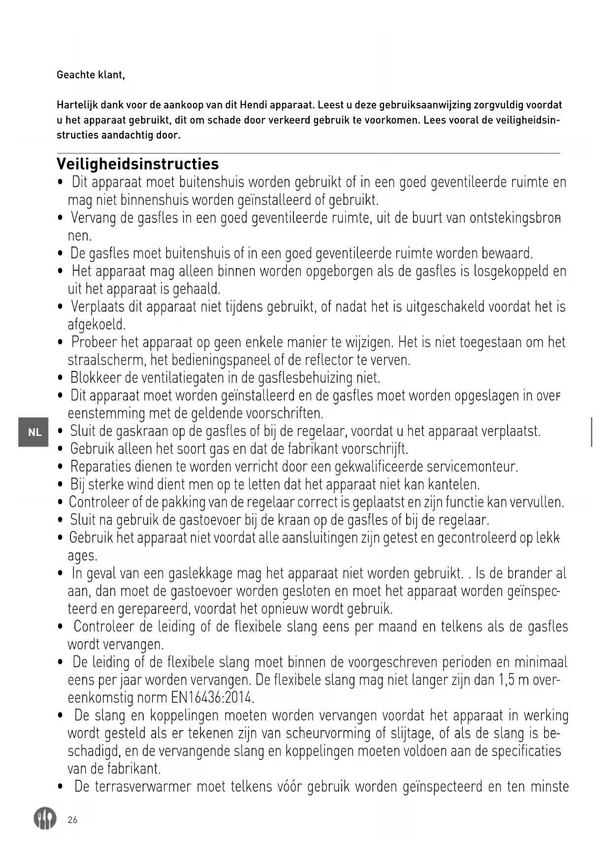Geachte klant, Hartelijk dank voor de aankoop van dit Hendi apparaat. Leest u deze gebruiksaanwijzing zorgvuldig voordat u het apparaat gebruikt, dit om schade door verkeerd gebruik te voorkomen. Lees vooral de veiligheidsin- structies aandachtig door. Veiligheidsinstructies
