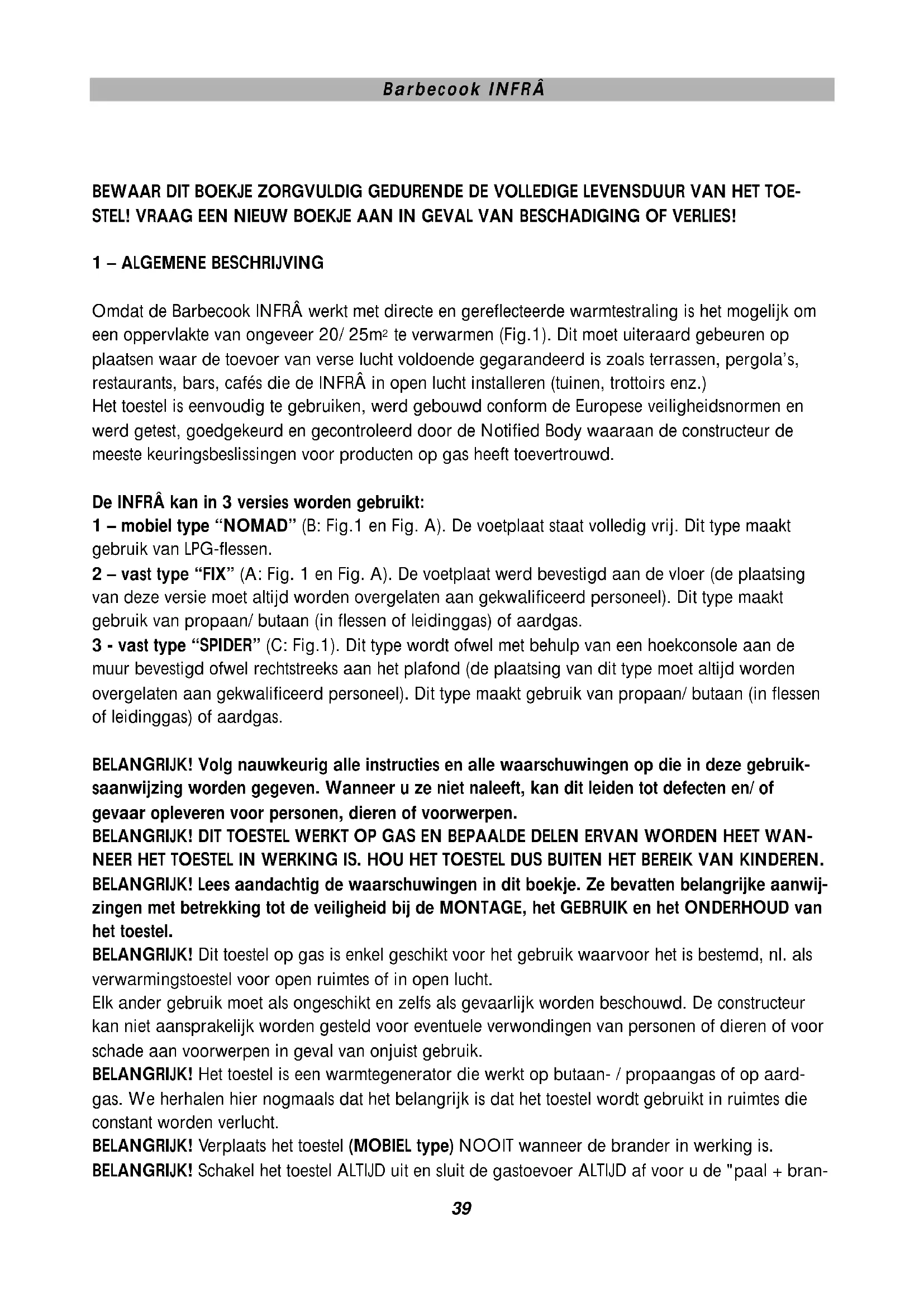 BELANGRIJK! DIT TOESTEL WERKT OP GAS EN BEPAALDE DELEN ERVAN WORDEN HEET WANNEER HET TOESTEL IN WERKING IS. HOU HET TOESTEL DUS BUITEN HET BEREIK VAN KINDEREN. BELANGRIJK! Lees aandachtig de waarschuwingen in dit boekje. Ze bevatten belangrijke aanwijzingen met betrekking tot de veilighheid bij de MONTAGE, het GEBRUIK en het ONDERHOUD van het toestel.