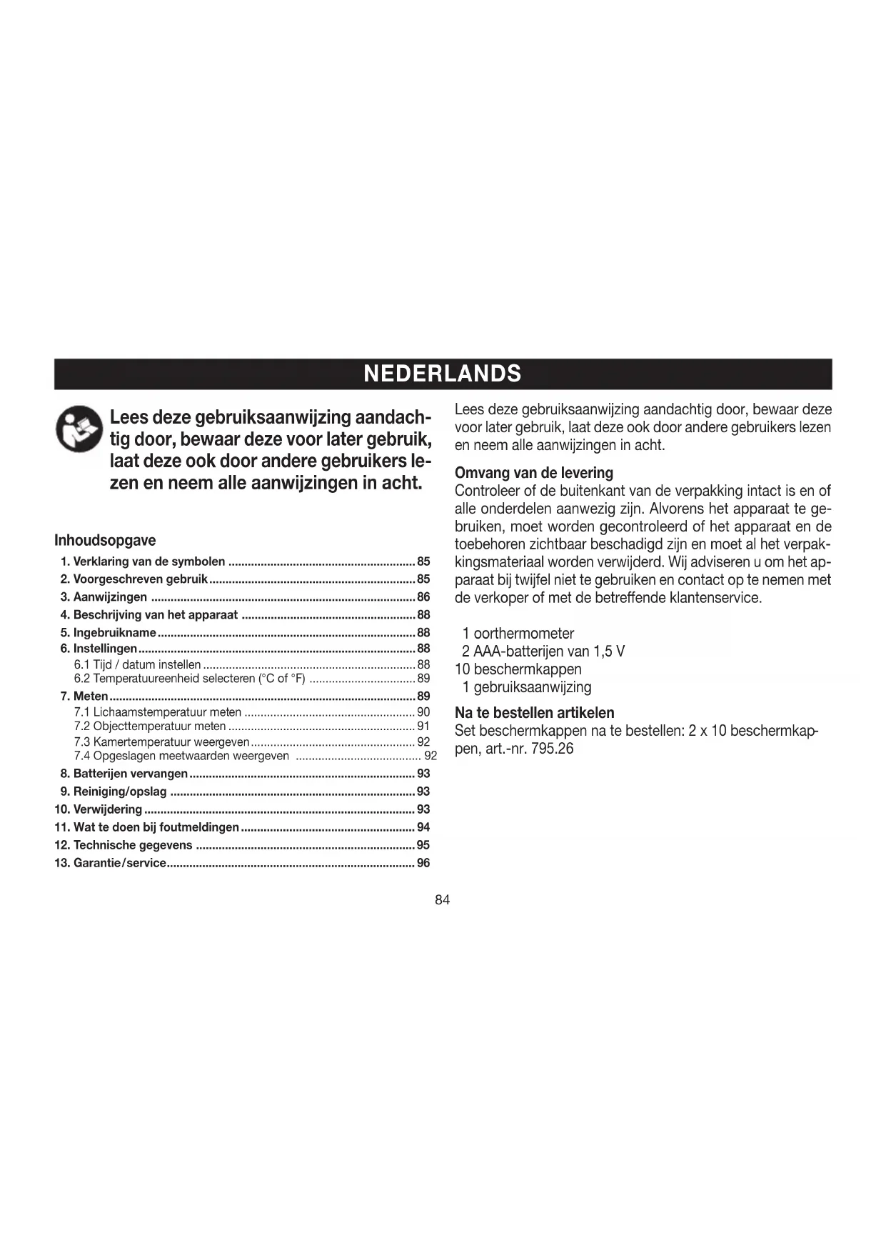 bereik -25°C – 55 °C (-13°F – 131 °F), luchtvoch- tigheid ≤ 95% (niet condenserend) Geheugen 10 geheugenplaatsen Weergave- nauwkeurigheid 0,1 °C of 0,1 °F Batterij DC 3V (2 AAA-batterijen van 1,5 V) Afmetingen 155 x 38 x 47 mm Gewicht Ca. 63 g (zonder batterijen) Beschermkappen 10 Automatische uitschakeling 60 seconden Levensduur batterij 3000 achtereenvolgende metingen of een jaar bij een tot twee metingen per dag in- clusief stand-bymodus. Veiligheidsklasse Aangesloten medisch apparaat van het type BF IP-beschermingsgraad IP 22, bescherming tegen het binnendrin- gen van water en stof Het serienummer staat op het apparaat of in het batterijvak.96