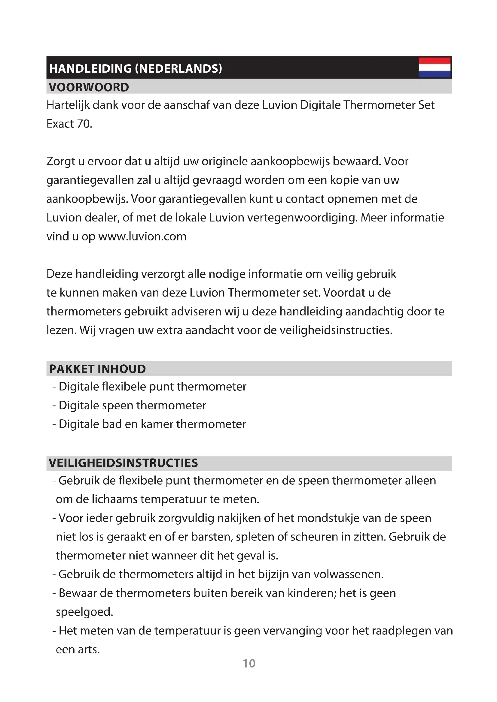 with a pair of tweezers10 HANDLEIDING (NEDERLANDS) VOORWOORD Hartelijk dank voor de aanschaf van deze Luvion Digitale Thermometer Set Exact 70. Zorgt u ervoor dat u altijd uw originele aankoopbewijs bewaard. Voor garantiegevallen zal u altijd gevraagd worden om een kopie van uw aankoopbewijs. Voor garantiegevallen kunt u contact opnemen met de Luvion dealer, of met de lokale Luvion vertegenwoordiging. Meer informatie vind u op www.luvion.com Deze handleiding verzorgt alle nodige informatie om veilig gebruik te kunnen maken van deze Luvion Thermometer set. Voordat u de thermometers gebruikt adviseren wij u deze handleiding aandachtig door te lezen. Wij vragen uw extra aandacht voor de veiligheidsinstructies. PAKKET INHOUD - Digitale exibele punt thermometer - Digitale speen thermometer - Digitale bad en kamer thermometer VEILIGHEIDSINSTRUCTIES - Gebruik de exibele punt thermometer en de speen thermometer alleen om de lichaams temperatuur te meten. - Voor ieder gebruik zorgvuldig nakijken of het mondstukje van de speen niet los is geraakt en of er barsten, spleten of scheuren in zitten. Gebruik de thermometer niet wanneer dit het geval is. - Gebruik de thermometers altijd in het bijzijn van volwassenen. - Bewaar de thermometers buiten bereik van kinderen; het is geen speelgoed. - Het meten van de temperatuur is geen vervanging voor het raadplegen van een arts.11