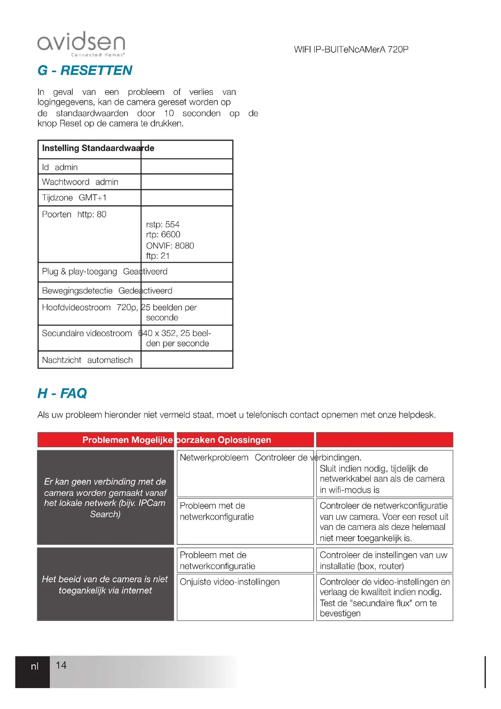 In geval van een probleem of verlies van logingegevens,kandecamerageresetwordenop de standaardwaarden door 10 seconden op de knopResetopdecameratedrukken. Instelling Standaardwaarde Id admin Wachtwoord admin Tijdzone Gmt+1 Poorten http:80 rstp:554 rtp:6600 ONVIF:8080 ftp:21 Plug&play-toegang Geactiveerd Bewegingsdetectie Gedeactiveerd Hoofdvideostroom 720p,25beeldenper seconde Secundairevideostroom 640x352,25beel- denperseconde Nachtzicht automatisch WiFi iP-buitencamera 720P G - rESEttEN Problemen Mogelijke oorzaken Oplossingen Onjuistevideo-instellingen Het beeld van de camera is niet toegankelijk via internet Probleemmetde netwerkconguratie Controleerdeinstellingenvanuw installatie(box,router) Controleerdevideo-instellingenen verlaagdekwaliteitindiennodig. Testde"secundaireux"omte bevestigen Er kan geen verbinding met de camera worden gemaakt vanaf het lokale netwerk (bijv. IPCam Search) Netwerkprobleem Controleerdeverbindingen. Sluitindiennodig,tijdelijkde netwerkkabelaanalsdecamera inwi-modusis Probleemmetde netwerkconguratie Controleerdenetwerkconguratie vanuwcamera.Voereenresetuit vandecameraalsdezehelemaal nietmeertoegankelijkis. H - fAQ Alsuwprobleemhierondernietvermeldstaat,moetutelefonischcontactopnemenmetonzehelpdesk.15