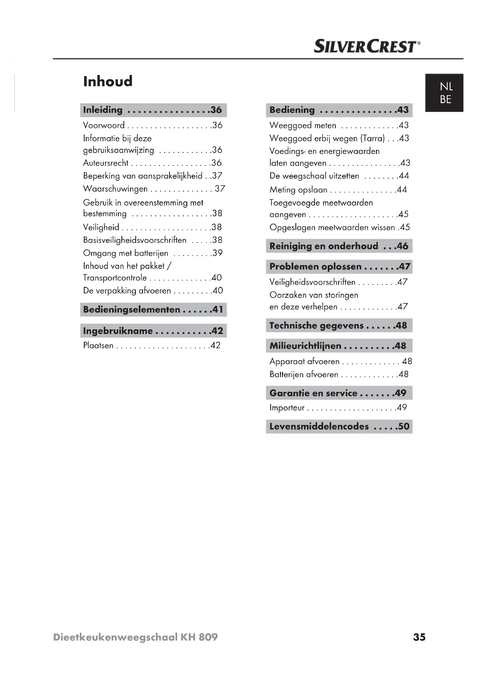 Inleiding Voorwoord Geachte klant, met de aankoop van dit apparaat heeft u gekozen voor een kwaliteitsproduct van SilverCrest , dat in technisch en functioneel opzicht voldoet aan de modernste standaard van ontwikkeling. Lees de hier gegeven informatie, zodat u snel vertrouwd raakt met uw apparaat en volledig gebruik kunt maken van alle functies ervan. Wij wensen uw veel plezier toe bij het gebruik. Informatie bij deze gebruiksaanwijzing Deze gebruiksaanwijzing is onderdeel van de dieet-keukenweegschaal KH 809 (navolgend apparaat genoemd) en geeft u belangrijke aanwijzingen voor het gebruik volgens de bestemming, de veiligheid, evenals de bediening van het apparaat. De gebruiksaanwijzing moet voortdurend nabij het apparaat beschikbaar zijn. Zij moet door iedere persoon gelezen en gebruikt worden, die belast is met de bediening van het apparaat. Bewaar de gebruiksaanwijzing en geef deze met het apparaat door aan de volgende eigenaar. Auteursrecht Deze documentatie is auteursrechtelijk beschermd. Behoudens alle rechten, ook die van de fotomechanische weergave, de reproduc- tie en het in omloop brengen door middel van speciale methodes (bijvoorbeeld verwerking van data, informatiedragers en datanetten), ook gedeeltelijk, evenals inhoudelijke en technische veranderingen.37 Inleiding Dieetkeukenweegschaal KH 809