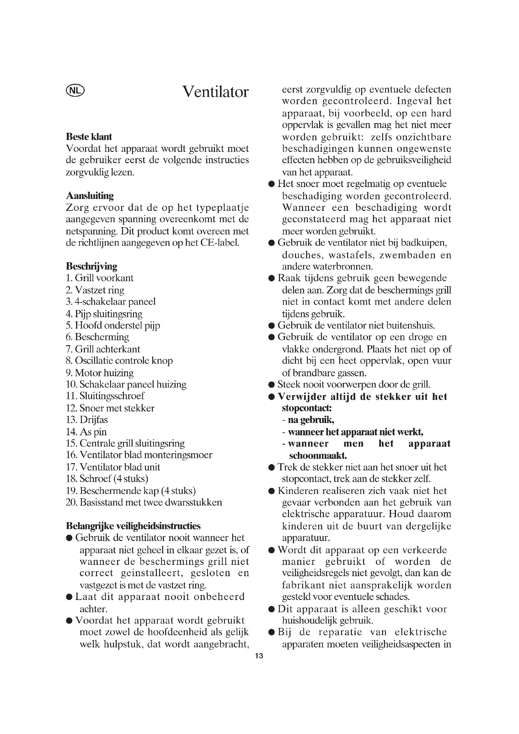 Belangrijke veiligheidsinstructies ● Gebruik de ventilator nooit wanneer het apparaat niet geheel in elkaar gezet is, of wanneer de beschermings grill niet correct geinstalleert, gesloten en vastgezet is met de vastzet ring. ● Laat dit apparaat nooit onbeheerd achter. ● Voordat het apparaat wordt gebruikt moet zowel de hoofdeenheid als gelijk welk hulpstuk, dat wordt aangebracht, eerst zorgvuldig op eventuele defecten worden gecontroleerd. Ingeval het apparaat, bij voorbeeld, op een hard oppervlak is gevallen mag het niet meer worden gebruikt: zelfs onzichtbare beschadigingen kunnen ongewenste effecten hebben op de gebruiksveiligheid van het apparaat. ● Het snoer moet regelmatig op eventuele beschadiging worden gecontroleerd. Wanneer een beschadiging wordt geconstateerd mag het apparaat niet meer worden gebruikt. ● Gebruik de ventilator niet bij badkuipen, douches, wastafels, zwembaden en andere waterbronnen. ● Raak tijdens gebruik geen bewegende delen aan. Zorg dat de beschermings grill niet in contact komt met andere delen tijdens gebruik. ● Gebruik de ventilator niet buitenshuis. ● Gebruik de ventilator op een droge en vlakke ondergrond. Plaats het niet op of dicht bij een heet oppervlak, open vuur of brandbare gassen. ● Steek nooit voorwerpen door de grill. ● Verwijder altijd de stekker uit het stopcontact: - na gebruik, - wanneer het apparaat niet werkt, - wanneer men het apparaat schoonmaakt. ● Trek de stekker niet aan het snoer uit het stopcontact, trek aan de stekker zelf. ● Kinderen realiseren zich vaak niet het gevaar verbonden aan het gebruik van elektrische apparatuur. Houd daarom kinderen uit de buurt van dergelijke apparatuur. ● Wordt dit apparaat op een verkeerde manier gebruikt of worden de veiligheidsregels niet gevolgt, dan kan de fabrikant niet aansprakelijk worden gesteld voor eventuele schades. ● Dit apparaat is alleen geschikt voor huishoudelijk gebruik. ● Bij de reparatie van elektrische apparaten moeten veiligheidsaspecten in