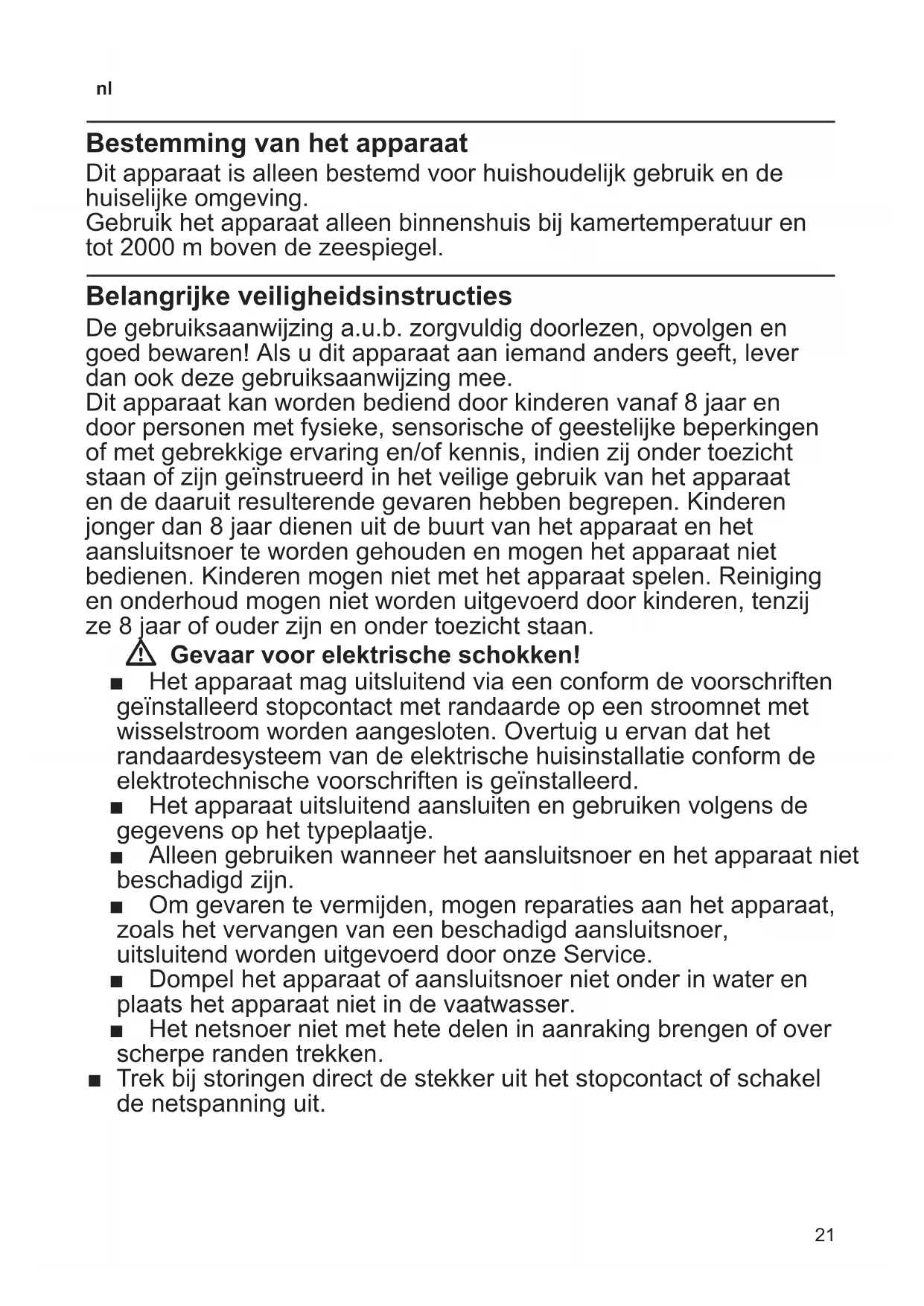 Dit apparaat kan worden bediend door kinderen vanaf 8aar en door personen met fysieke, sensorische of geestelijkke beperkingen of met gebrekkige ervaring en/of kennis, indien zij onder toezicht staan of+zijn geinstrueerd in het veilige gebruik van het apparaat en de waaruit resulterende bevaren hebben begrepen. Kinderenjonger dan 8aar dienen uit de buurt van het apparaat en het aansluitsnoer te worden gehonden en mogen het apparaat Niet bedieren. Kinderen mogen nicht met het apparaat spelen. Reinigung en onderhoud mogen nicht worden uitgevoerd door kinderen, tenzij ze 8aar of ouder+zijn en onder toezicht staan.