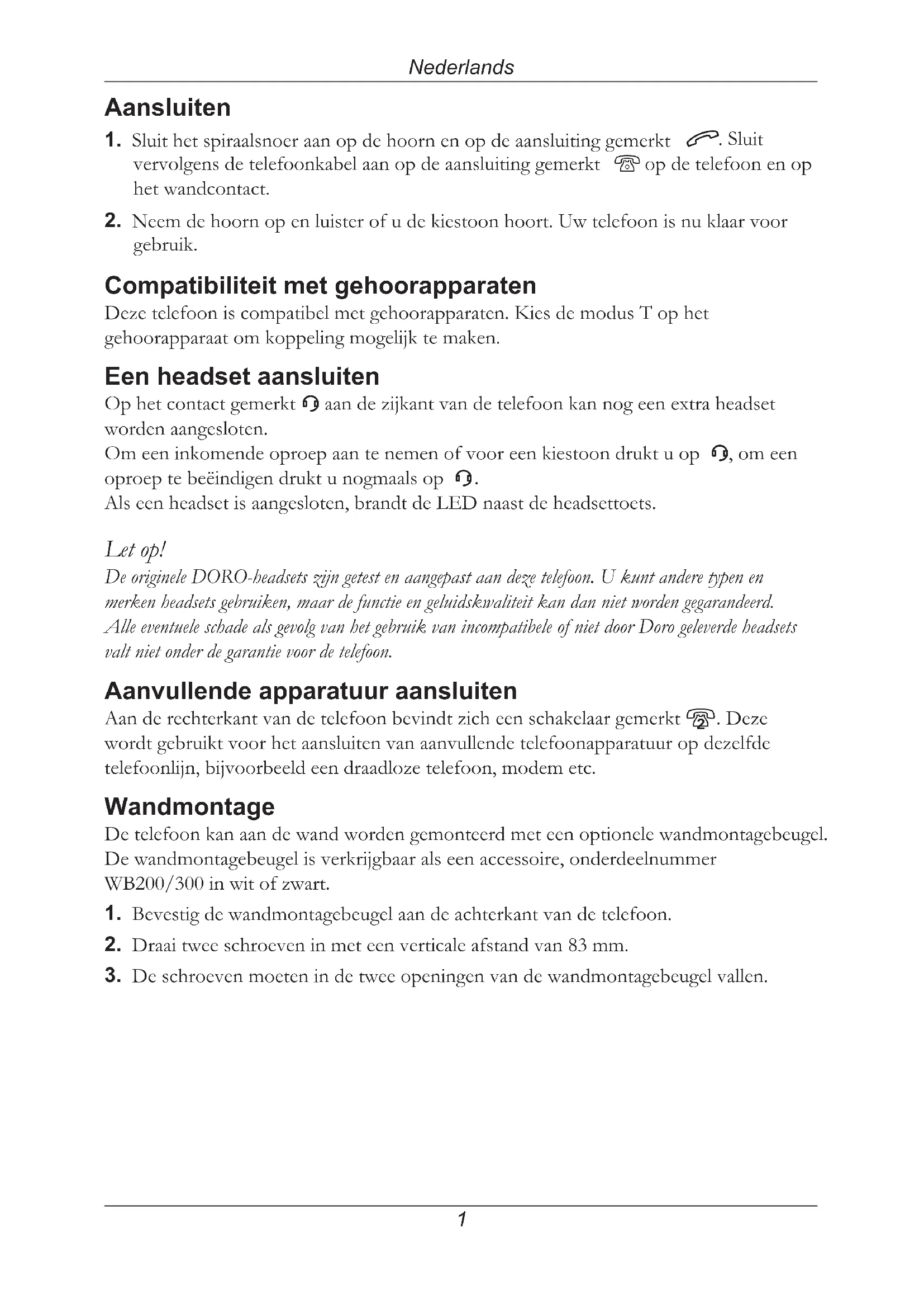Als een headset is aangesloten, brandt de LED naast de headsettoets. Let op! De originele DORO-headsets zijn getest en aangepast aan deze telefoon. U kunt andere typen en merken headsets gebruiken, maar de functie en geluidskwaliteit kan dan niet worden gegarandeerd. Alle eventuele schade als gevolg van het gebruik van incompatibele of niet door Doro geleverde headsets valt niet onder de garantie voor de telefoon. Aanvullende apparatuur aansluiten Aan de rechterkant van de telefoon bevindt zich een schakelaar gemerkt 8. Deze wordt gebruikt voor het aansluiten van aanvullende telefoonapparatuur op dezelfde telefoonlijn, bijvoorbeeld een draadloze telefoon, modem etc. Wandmontage De telefoon kan aan de wand worden gemonteerd met een optionele wandmontagebeugel. De wandmontagebeugel is verkrijgbaar als een accessoire, onderdeelnummer WB200/300 in wit of zwart.