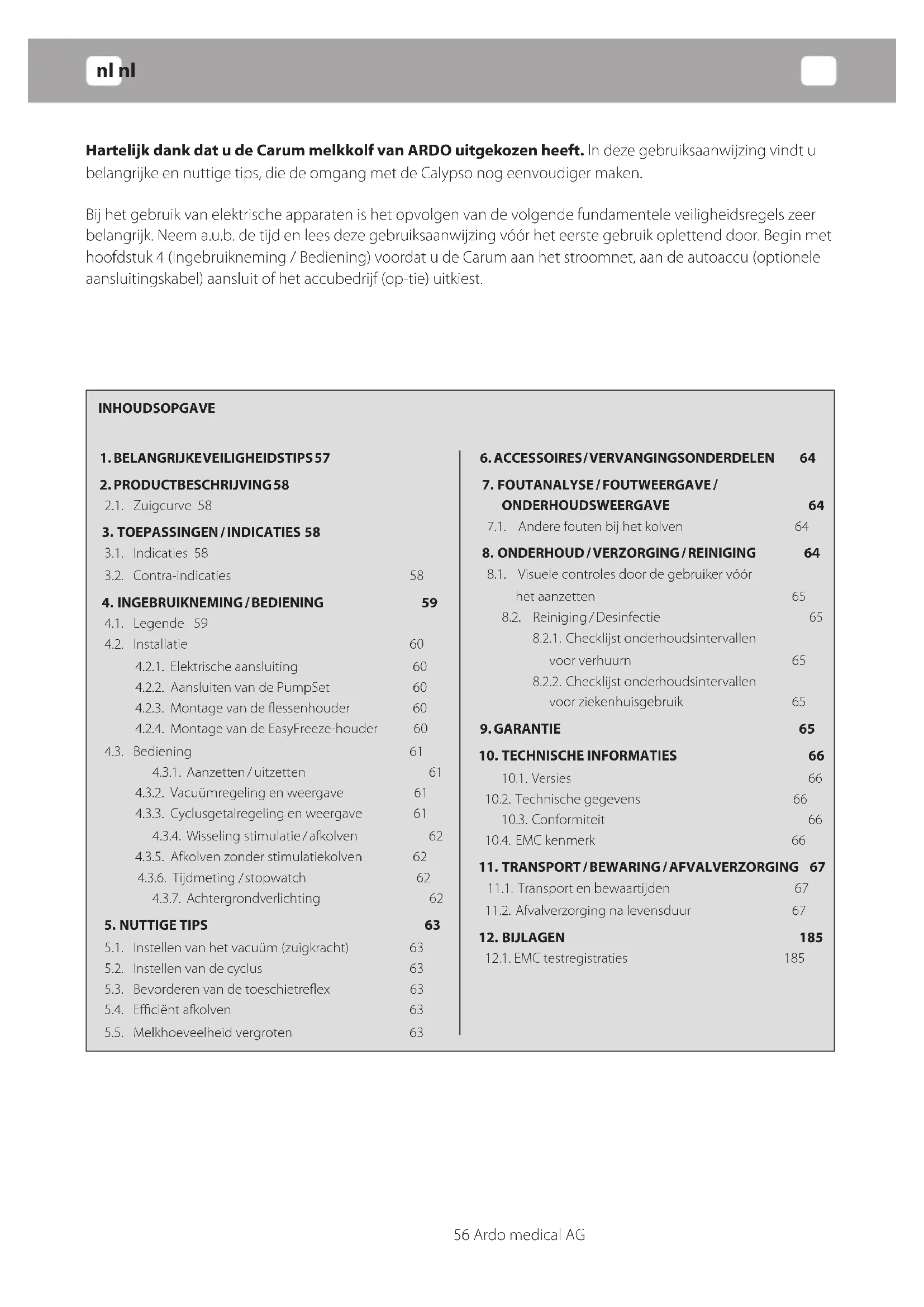 i.nl nl 56 Ardo medical AG Hartelijk dank dat u de Carum melkkolf van ARDO uitgekozen heeft. Indezegebruiksaanwijzingvindtu belangrijkeennuttigetips,diedeomgangmetdeCalypsonogeenvoudigermaken. Bijhetgebruikvanelektrischeapparatenishetopvolgenvandevolgendefundamenteleveiligheidsregelszeer belangrijk.Neema.u.b.detijdenleesdezegebruiksaanwijzingvóórheteerstegebruikoplettenddoor.Beginmet hoofdstuk 4 (Ingebruikneming / Bediening) voordat u de Carum aan het stroomnet, aan de autoaccu (optionele aansluitingskabel)aansluitofhetaccubedrijf(op-tie)uitkiest. INHOUDSOPGAVE