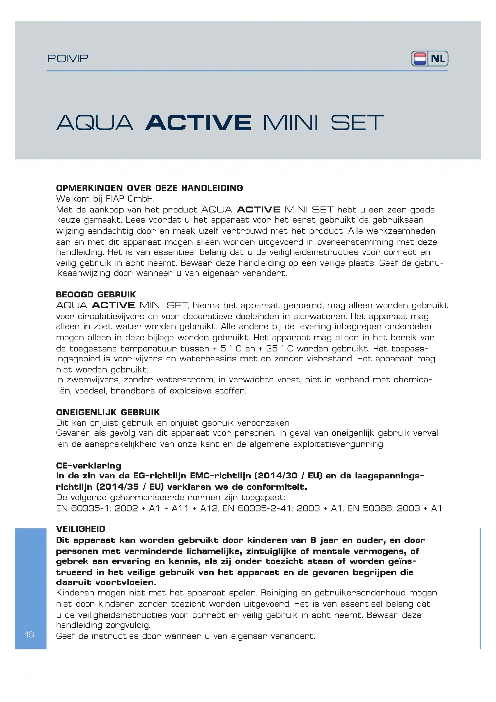 Download de handleiding voor uw Waterpomp in PDF-formaat gratis! Vind uw handleiding Aqua Active Mini set 2000 - Fiap en neem uw elektronisch apparaat weer in handen. Op deze pagina staan alle documenten die nodig zijn voor het gebruik van uw apparaat. Aqua Active Mini set 2000 van het merk Fiap.
