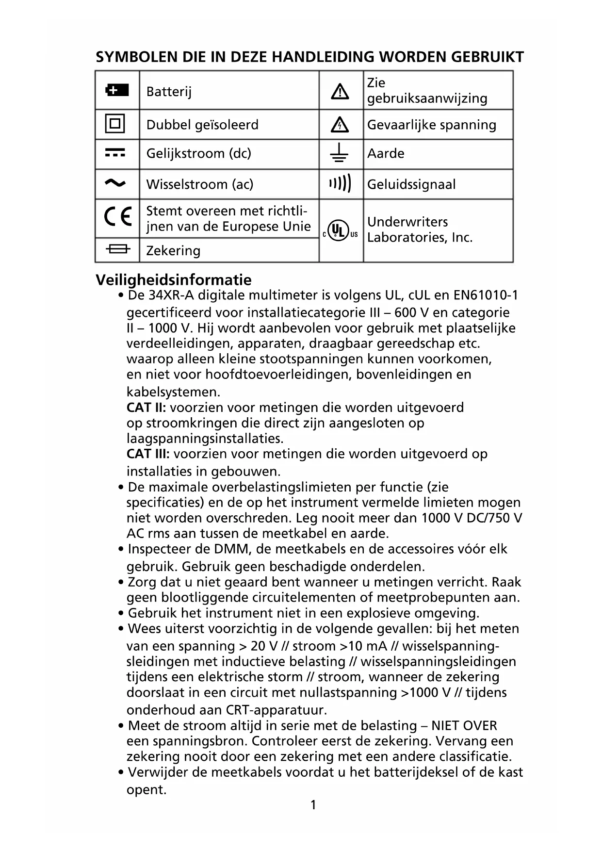 - De 34XR-A digitale multimeter is volgens UL, cUL en EN61010-1 gecertificeerd voor installatiecategorie III – 600 V en categorie II – 1000 V. Hij wordt aanbevolen voor gebruik met plaatselijke verdeelleidingen, apparaten, draagbaar gereedschap etc. waarop alleen kleine stootspanningen kunnen voorkomen, en niet voor hoofdtoevoerleidingen, bovenleidingen en kabelsystemen. CAT II: voorzien voor metingen die worden uitgevoerd op stroomkringen die direct zijn aangesloten op laagspanningsinstallaties. CAT III: voorzien voor metingen die worden uitgevoerd op installaties in gebouwen.