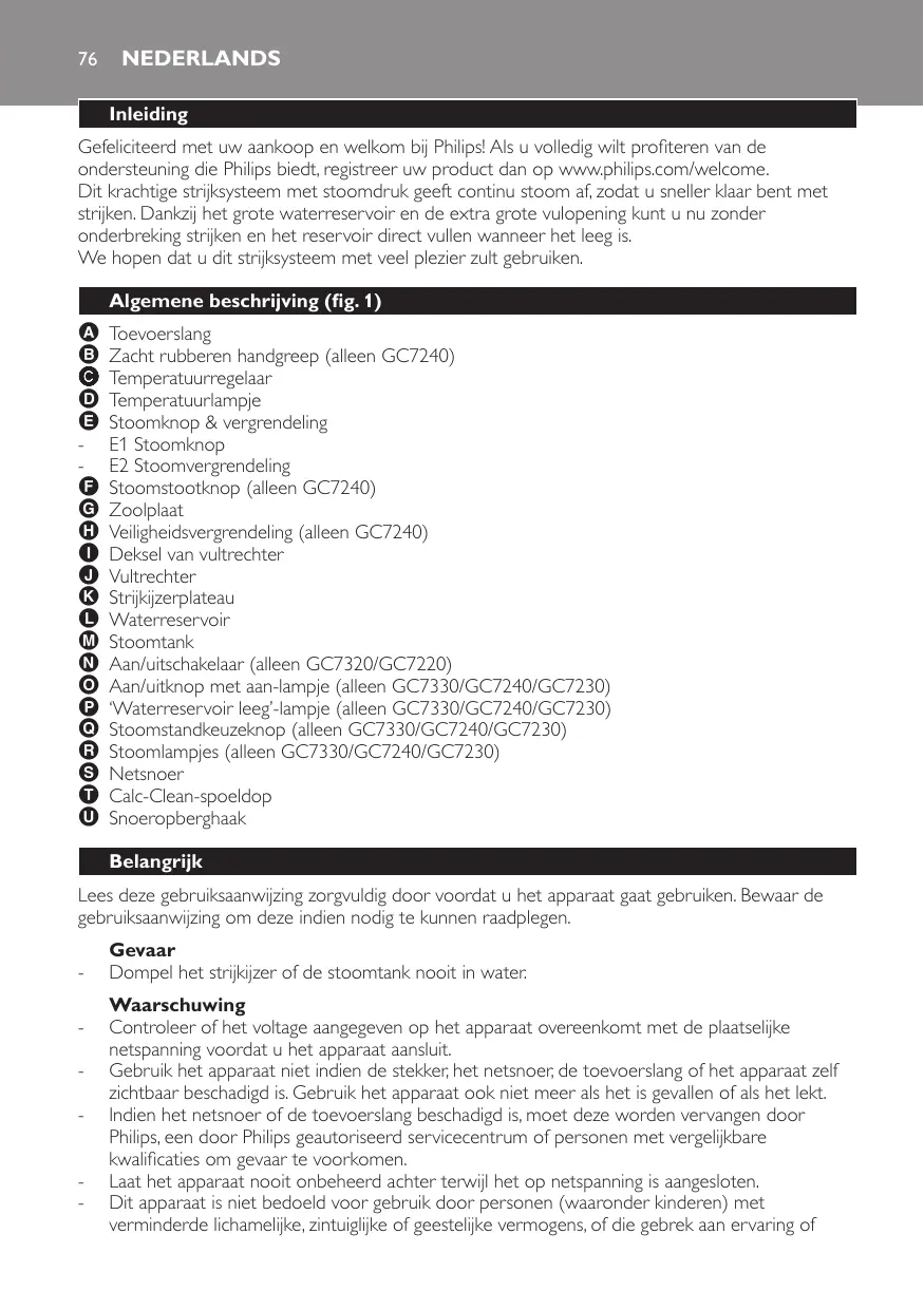 Toevoerslang Zacht rubberen handgreep (alleen GC7240) Temperatuurregelaar Temperatuurlampje Stoomknop & vergrendeling E1 Stoomknop E2 Stoomvergrendeling Stoomstootknop (alleen GC7240) Zoolplaat Veiligheidsvergrendeling (alleen GC7240) Deksel van vultrechter Vultrechter Strijkijzerplateau Waterreservoir Stoomtank Aan/uitschakelaar (alleen GC7320/GC7220) Aan/uitknop met aan-lampje (alleen GC7330/GC7240/GC7230) ‘Waterreservoir leeg’-lampje (alleen GC7330/GC7240/GC7230) Stoomstandkeuzeknop (alleen GC7330/GC7240/GC7230) Stoomlampjes (alleen GC7330/GC7240/GC7230) Netsnoer Calc-Clean-spoeldop Snoeropberghaak Belangrijk Lees deze gebruiksaanwijzing zorgvuldig door voordat u het apparaat gaat gebruiken. Bewaar de gebruiksaanwijzing om deze indien nodig te kunnen raadplegen.