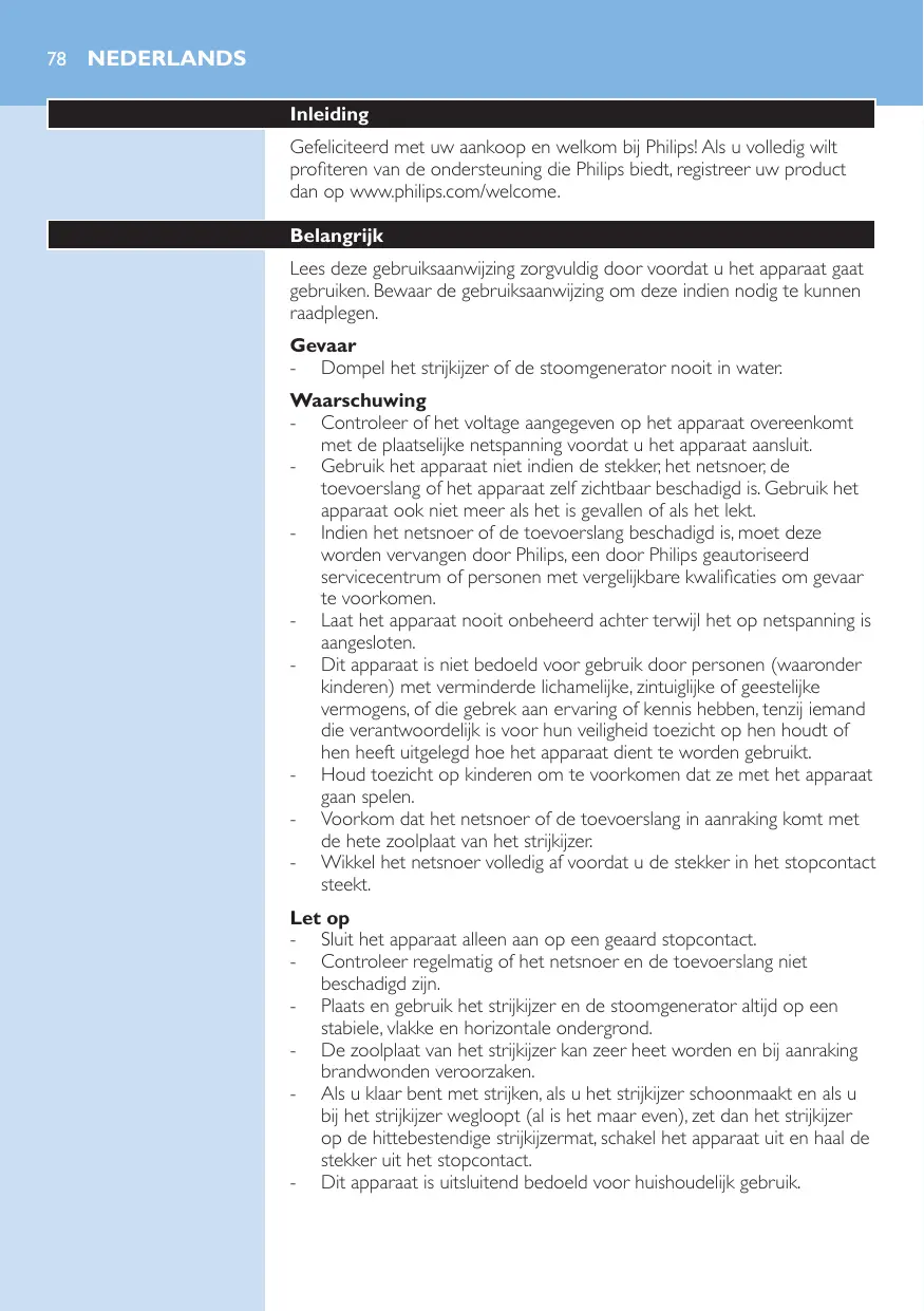 Nederlands Inleiding Gefeliciteerd met uw aankoop en welkom bij Philips! Als u volledig wilt profiteren van de ondersteuning die Philips biedt, registreer uw product dan op www.philips.com/welcome. Belangrijk Lees deze gebruiksaanwijzing zorgvuldig door voordat u het apparaat gaat gebruiken. Bewaar de gebruiksaanwijzing om deze indien nodig te kunnen raadplegen. Gevaar - Dompel het strijkijzer of de stoomgenerator nooit in water. Waarschuwing - Controleer of het voltage aangegeven op het apparaat overeenkomt met de plaatselijke netspanning voordat u het apparaat aansluit. - Gebruik het apparaat niet indien de stekker, het netsnoer, de toevoerslang of het apparaat zelf zichtbaar beschadigd is. Gebruik het apparaat ook niet meer als het is gevallen of als het lekt. - Indien het netsnoer of de toevoerslang beschadigd is, moet deze worden vervangen door Philips, een door Philips geautoriseerd servicecentrum of personen met vergelijkbare kwalificaties om gevaar te voorkomen. - Laat het apparaat nooit onbeheerd achter terwijl het op netspanning is aangesloten. - Dit apparaat is niet bedoeld voor gebruik door personen (waaronder kinderen) met verminderde lichamelijke, zintuiglijke of geestelijke vermogens, of die gebrek aan ervaring of kennis hebben, tenzij iemand die verantwoordelijk is voor hun veiligheid toezicht op hen houdt of hen heeft uitgelegd hoe het apparaat dient te worden gebruikt. - Houd toezicht op kinderen om te voorkomen dat ze met het apparaat gaan spelen. - Voorkom dat het netsnoer of de toevoerslang in aanraking komt met de hete zoolplaat van het strijkijzer. - Wikkel het netsnoer volledig af voordat u de stekker in het stopcontact steekt. Let op - Sluit het apparaat alleen aan op een geaard stopcontact. - Controleer regelmatig of het netsnoer en de toevoerslang niet beschadigd zijn. - Plaats en gebruik het strijkijzer en de stoomgenerator altijd op een stabiele, vlakke en horizontale ondergrond. - De zoolplaat van het strijkijzer kan zeer heet worden en bij aanraking brandwonden veroorzaken. - Als u klaar bent met strijken, als u het strijkijzer schoonmaakt en als u bij het strijkijzer wegloopt (al is het maar even), zet dan het strijkijzer op de hittebestendige strijkijzermat, schakel het apparaat uit en haal de stekker uit het stopcontact. - Dit apparaat is uitsluitend bedoeld voor huishoudelijk gebruik. Nederlands