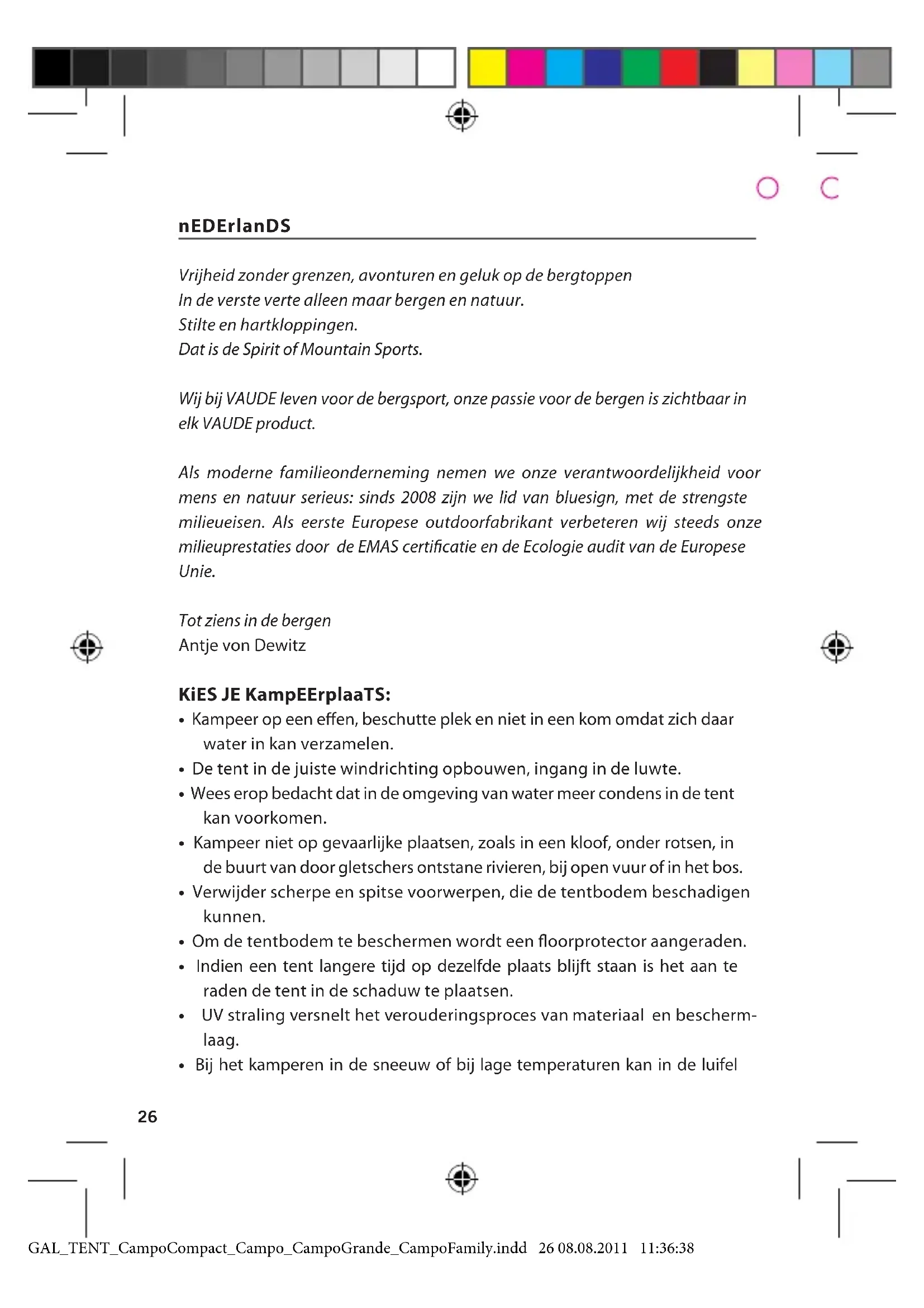 - Non tendere i tiranti nelle zone di passaggio perché al buio vi si potrebbe inciampare. GAL_TENT_CampoCompact_Campo_CampoGrande_CampoFamily.indd 25 08.08.2011 11:36:3826 nEDErlanDS Vrijheid zonder grenzen, avonturen en geluk op de bergtoppen In de verste verte alleen maar bergen en natuur. Stilte en hartkloppingen. Dat is de Spirit of Mountain Sports. Wij bij VAUDE leven voor de bergsport, onze passie voor de bergen is zichtbaar in elk VAUDE product. Als moderne familieonderneming nemen we onze verantwoordelijkheid voor mens en natuur serieus: sinds 2008 zijn we lid van bluesign, met de strengste milieueisen. Als eerste Europese outdoorfabrikant verbeteren wij steeds onze milieuprestaties door de EMAS certicatie en de Ecologie audit van de Europese Unie. Tot ziens in de bergen Antje von Dewitz KiES jE KampEErplaaTS: