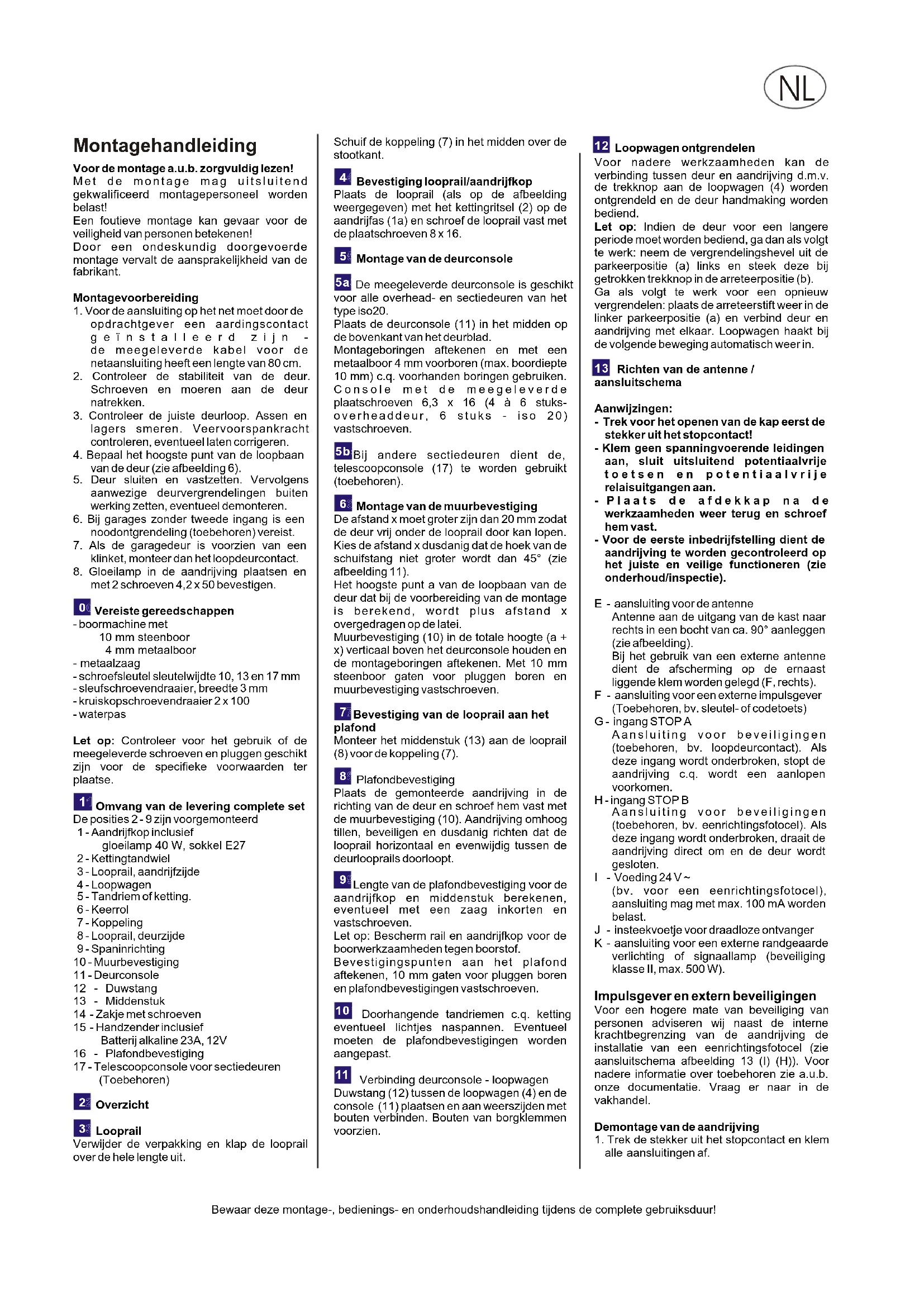 Menuveld 6: krachtbegrenzing voor het sluitenNa ca. 2 seconden knippert de indicator en de ingestelde waarde voor de krachtbegrenzing voor het sluiten wordt weergegeven. Met toets en kan de waarde voor de krachtbegrenzing worden verhoogd of verlaagd. Na het instellen toets indrukken. Het cijfer 0 verschijnt. Vervolgens de krachtinstelling controleren en eventueel opnieuw instellen. De kracht aan de hoofdsluitkant mag de maximale waarde van 150 N niet overschrijden!LET OP! Een te hoog ingestelde kracht betekent gevaar voor verwondingen. De waarde is in de fabriek ingesteld op 4! Controle van de krachtbegrenzing inrichting- Hindernis (bv. B. doos van de aandrijving) onder de onderkant van de deur plaatsen. - Deur vanuit de eindpositie OPEN starten. - De aandrijving loopt op de hindernis, stopt en zet de deur weer terug in de bovenste eindpositie.- De punt (a) moet ca. 1 seconde lang worden uitgeschakeld. Dan functioneert de aandrijving juist. Indien de veren van de deur zijn gewijzigd, moet het krachtleerproces opnieuw worden doorgevoerd:Ga over naar menustap 5 en houd de toets 3 seconden lang ingedrukt. Het cijfer 0 verschijnt. Vervolgens wordt het krachtleerproces doorgevoerd als onder punt 18a beschreven. Bijzondere instellingen Menuveld 7: lichttijdenHoud toets 3 seconden lang ingedrukt. Cijfer 3 verschijnt. Toets verschillende keren indrukken tot menustap 6 wordt weergegeven. Toets opnieuw 3 seconden lang ingedrukt houden tot cijfer 7 verschijnt. Menu Lichttijd Waarschuwings waarde tijdBij ingestelde waarschuwingstijd knippert het licht voordat de aandrijving start en tijdens de beweging. Deze waarde is in de fabriek ingesteld op 1. Menuveld 8: traject met vertraagde aanloop/stopToets D indrukken. Cijfer 8 verschijnt. 0 60 s - 1 90 s - 2 120 s - 3 240 s - 4 0 s 3 s 5 90 s 3 s 6 240 s 3 s 7 0 s 10 s 8 90 s 10 s 9 240 s 10 s Bewaar deze montage-, bedienings- en onderhoudshandleiding tijdens de complete gebruiksduur! NLBedieningshandleiding Trek steeds voordat u met werkzaamheden aan de aandrijving begint die stekker uit het stopcontact!Onderwijs alle personen die de deurinstallatie gebruiken in het juiste en veilige gebruik ervan:Bij het bedienen van de aandrijvingen moeten de open- en sluitprocessen worden gecontroleerd. Handzenders horen niet thuis in handen van kinderen. In het draaibereik van de deur mogen zich geen personen of voorwerpen bevinden. FunctieDe garagedeuraandrijving kan worden bediend door impulsgevers zoals handzenders, sleuteltoetsen e.d. Er is slechts een kort impuls vereist.Eerst impuls:Aandrijving start en beweegt de deur naar de ingestelde eindpositie OPEN of DICHT.Impuls tijdens het bewegingsproces: deur stoptNieuw impuls:De deur loopt in de tegenovergestelde richting.Interne beveiligingDe deur loopt tijdens het sluitproces op een hindernis, stopt de aandrijving en geeft de hindernis vrij doordat de deur wordt geopend tot in de bovenste eindpositie. Tijdens de laatste 2 seconden van het sluitproces wordt de deur slechts een spleet hoog geopend om de hindernis vrij te geven. De binnenkant van de garage is echter niet zichtbaar. Indien de deur tijdens het openingsproces op een hindernis stoot, stopt de aandrijving direct. De deur kan worden gesloten door opnieuw een impuls te geven. Externe beveiligingAansluitschema afbeelding 13Loopdeurcontact (STOP A)Een geopende loopdeur stopt de aandrijving direct c.q. voorkomt het herstarten van de aandrijving. Fotocel (STOP B)Indien de fotocel tijdens het sluitproces wordt onderbroken, wordt de deur gestopt en in de andere richting bewogen. Een onderbreking van de fotocel tijdens het openingsproces heeft geen invloed. Fotocel (STOP B)Indien de fotocel tijdens het sluitproces wordt onderbroken, wordt de deur gestopt en in de andere richting bewogen. Een onderbreking van de fotocel tijdens het openingsproces heeft geen invloed. Noodontkoppeling Tijdens instelwerkzaamheden, stroomstoring of storingen kan de deur handmaking worden bediend door de trekknop aan de loopwagen van de aandrijving te ontgrendelen. Mocht de deur voor een langere periode handmaking moeten worden bediend, plaats dan de arreteerstift dienovereenkomstig (zie afbeelding 12). De deurvergrendeling die voor het bedrijf met aandrijving werd stilgezet, moet weer worden gemonteerd omdat de gesloten deur anders niet is afgesloten. Voor de heringebruikname van de aandrijving wordt de vergrendelingshevel weer in de parkeerpositie (a) gezet en de deurvergrendeling stilgezet. Na een impuls wordt de deur automatisch weer met de deuraandrijving vergrendeld. VerlichtingDe verlichting wordt na het impuls voor de start automatisch ingeschakeld en na afloop van de ingestelde tijd (in de fabriek ingesteld op ca. 90 seconden) ook automatisch weer uitgeschakeld.Een tweede toets op de handzender kan worden geprogrammeerd op licht dat na 4 minuten wordt uitgeschakeld (afbeelding 16). Als de toets op de handzender wordt ingedrukt, wordt het licht onafhankelijk van de motor ingeschakeld en na 4 minuten weer uitgeschakeld. Verwisselen van de gloeilamp:Trek de stekker uit het stopcontact en open de lampenkap met een kruiskopschroevendraaier (2 x 100). Gloeilamp verwisselen (230 V, 40 W, sokkel E27) en lampenkap weer vastschroeven. SignaallampIndien er ter signalering van het open- en sluitproces een signaallamp geïnstalleerd is, knippert deze samen met de lamp in de aandrijving zodra er een startimpuls wordt gegeven. De aandrijving start vertraagd overeenkomstig de ingestelde waarschuwingstijd (zie menustap 7).HandzenderProgrammeren van andere handzenders: Zie de menustappen 1 en 2 (afbeelding 15 en 16). Verwisselen van de batterij: schuif de deksel van het batterijvakje van de handzender af. Haal de batterij eruit. Plaats een nieuwe batterij (alkaline 23A, 12V). Let op de juiste poolrichting! Schuif de deksel er weer op. Voeg lege batterijen toe aan de stroom voor bijzonder afval! Onderhoud/inspectie Ter wille van uw eigen veiligheid adviseren wij om de deur voor de eerste inbedrij