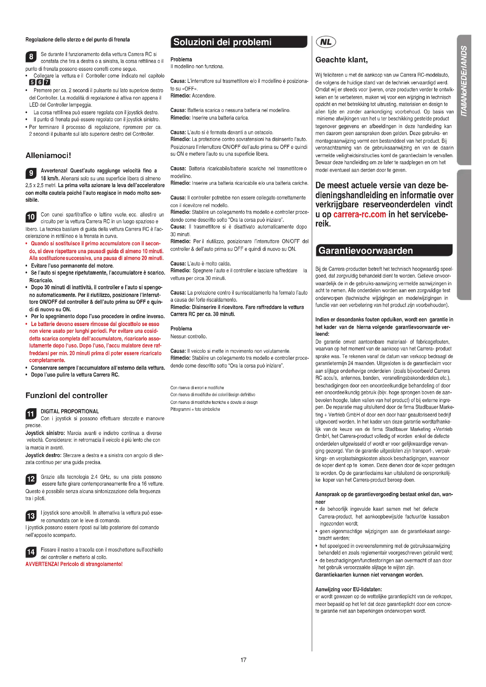 vettura per circa 30 minuti. Causa: La protezione contro il surriscaldamento ha fermato l’auto a causa del forte riscaldamento. Rimedio: Disinserire il ricevitore. Fare raffreddare la vettura Carrera RC per ca. 30 minuti. Problema Nessun controllo. Causa: Il veicolo si mette in movimento non volutamente. Rimedio: Stabilire un collegamento tra modello e controller proce- dendo come descritto sotto “Ora la corsa può iniziare”. Con riserva di errori e modificheCon riserva di modifiche dei colori/design definitivoCon riserva di modifiche tecniche e dovute al designPittogrammi = foto simboliche Geachte klant, Wij feliciteren u met de aankoop van uw Carrera RC-modelauto, die volgens de huidige stand van de techniek vervaardigd werd. Omdat wij er steeds voor ijveren, onze producten verder te ontwik- kelen en te verbeteren, maken wij voor een wijziging in technisch opzicht en met betrekking tot uitrusting, materialen en design te allen tijde en zonder aankondiging voorbehoud. Op basis van minieme afwijkingen van het u ter beschikking gestelde product tegenover gegevens en afbeeldingen in deze handleiding kan men daarom geen aanspraken doen gelden. Deze gebruiks- en montageaanwijzing vormt een bestanddeel van het product. Bij veronachtzaming van de gebruiksaanwijzing en van de daarin vermelde veiligheidsinstructies komt de garantieclaim te vervallen. Bewaar deze handleiding om ze later te raadplegen en om het model eventueel aan derden door te geven. De meest actuele versie van deze be- dieningshandleiding en informatie over verkrijgbare reserveonderdelen vindt u op carrera-rc.com in het servicebe- reik. Garantievoorwaarden Bij de Carrera-producten betreft het technisch hoogwaardig speel- goed, dat zorgvuldig behandeld dient te worden. Gelieve onvoor- waardelijk de in de gebruiks-aanwijzing vermelde aanwijzingen in acht te nemen. Alle onderdelen worden aan een zorgvuldige test onderworpen (technische wijzigingen en modelwijzigingen in functie van een verbetering van het product zijn voorbehouden). Indien er desondanks fouten opduiken, wordt een garantie in het kader van de hierna volgende garantievoorwaarde ver- leend: De garantie omvat aantoonbare materiaal- of fabricagefouten, waarvan op het moment van de aankoop van het Carrera- product sprake was. Te rekenen vanaf de datum van verkoop bedraagt de garantietermijn 24 maanden. Uitgesloten is de garantieclaim voor aan slijtage onderhevige onderdelen (zoals bijvoorbeeld Carrera RC accu’s, antennes, banden, versnellingsbakonderdelen etc.), beschadigingen door een onoordeelkundige behandeling of door een onoordeelkundig gebruik (bijv. hoge sprongen boven de aan- bevolen hoogte, laten vallen van het product) of bij externe ingre- pen. De reparatie mag uitsluitend door de firma Stadlbauer Marke- ting + Vertrieb GmbH of door een door haar geautoriseerd bedrijf uitgevoerd worden. In het kader van deze garantie wordt, afhanke- lijk van de keuze van de firma Stadlbauer Marketing + Vertrieb GmbH, het Carrera-product volledig of worden enkel de defecte onderdelen uitgewisseld of wordt er voor gelijkwaardige vervan- ging gezorgd. Van de garantie uitgesloten zijn transport-, verpak- kings- en verplaatsingskosten alsook beschadigingen, waarvoor de koper dient op te komen. Deze dienen door de koper gedragen te worden. Op de garantieclaims kan uitsluitend de oorspronkelij- ke koper van het Carrera-product beroep doen. Aanspraak op de garantievergoeding bestaat enkel dan, wan- neer